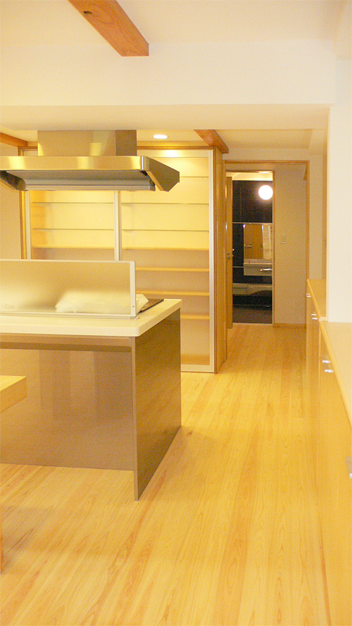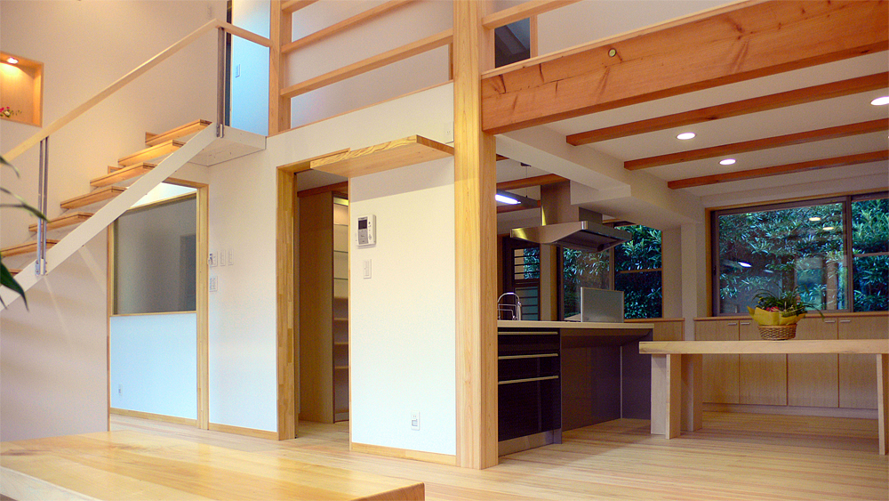 キッチンから洗面、お風呂への動線はまっすぐ。床はすべて桧で、建具が上吊のバリアフリー仕様(写真左)。飾り棚があるシンプルな階段の踏み面は鉄板を木ではさんだオリジナル(写真右)。