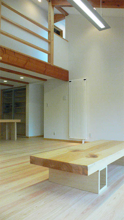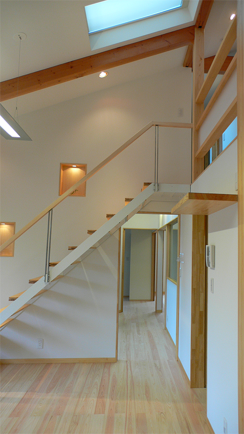 明暗と高低を楽しめる広々と抜けたリビング・ダイニング・キッチンは発泡断熱材で気密性が高く、ガス暖房で家中が暖かい。2階の廊下から一階が見渡せます。