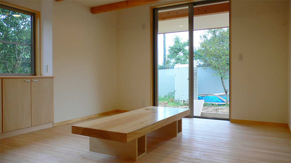家全体にふんだんに木材を使用。リビングから見える緑、そして白い壁と相まってナチュラルな雰囲気を生み出しています。特に、床に使用した檜は、吸湿性にも優れ、その香りもアロマ効果をもたらし、まるで森の中にいるような、何とも言えな心地よさを感じます。