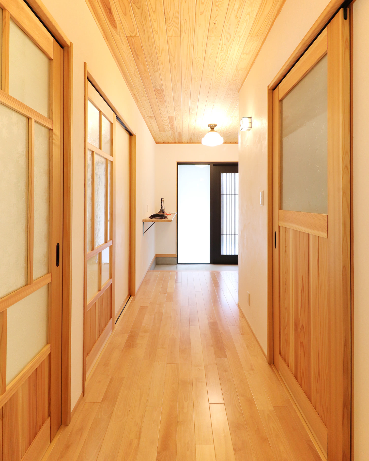 廊下の幅は120cmあるので、車椅子にも対応。右手は納戸で、収納はすべてこちらに集約。