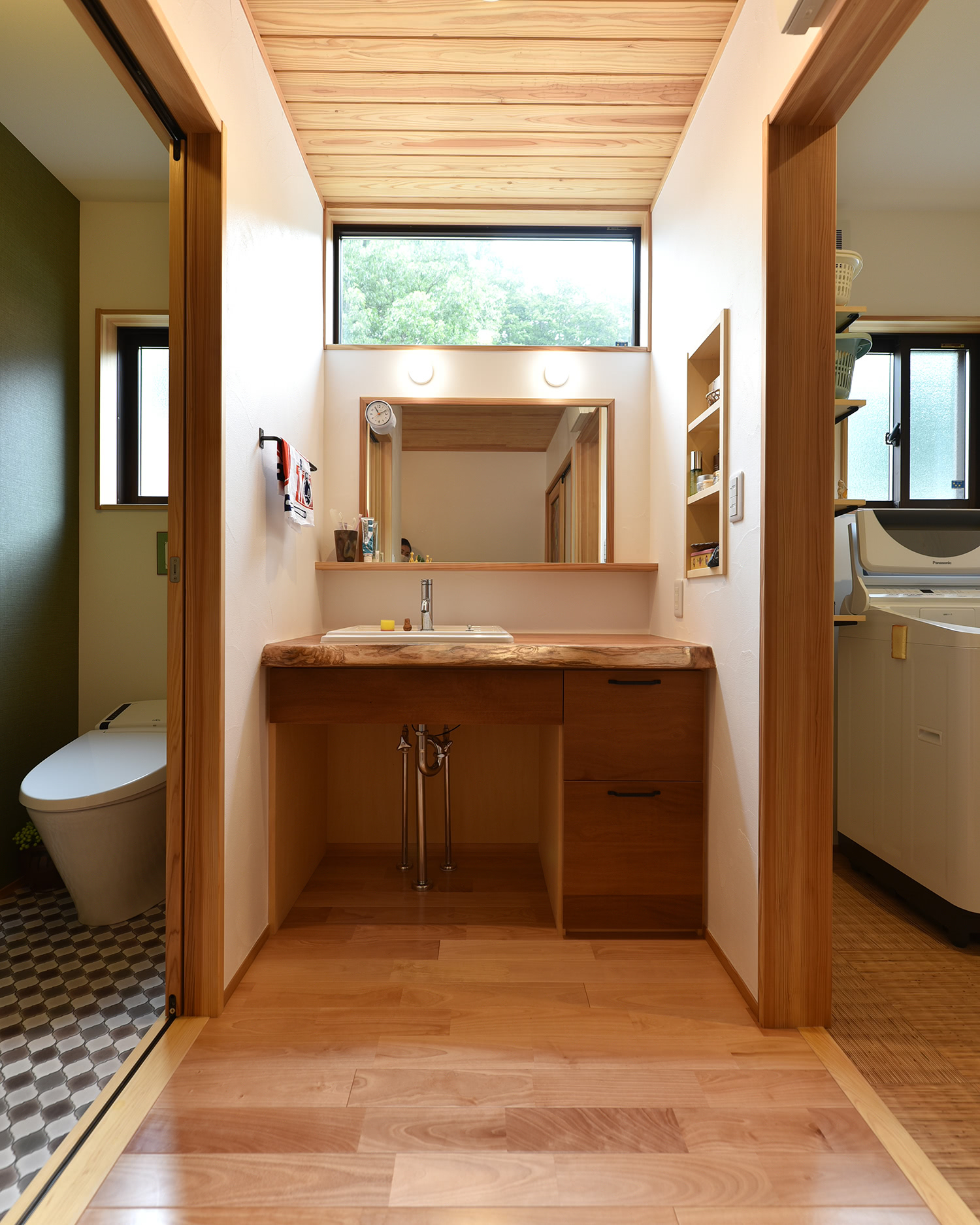 寝室の近くに水回りを配置。洗面所から後ろの山が借景できるところがお気に入りポイントです。女性スタッフ提案のトイレの抹茶色と市松格子のようなフロアも素敵です。ケヤキの一枚板カウンターが場を格上げしています。