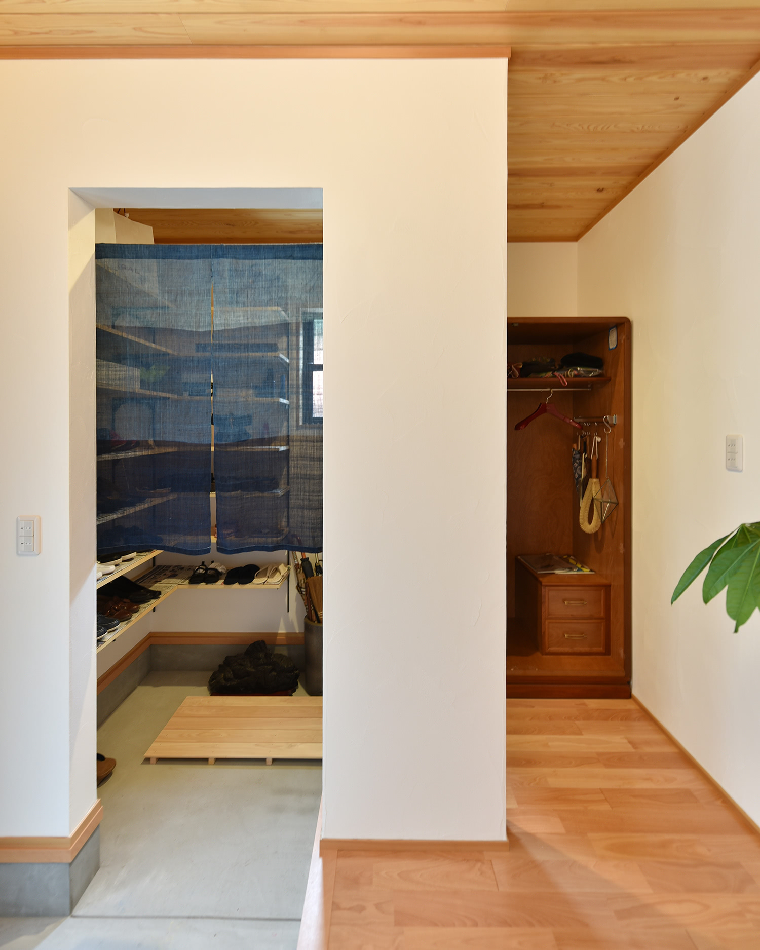 靴箱はあえて設けずシューズクローゼットとタンスを再加工して活用。麻の暖簾で涼やかに仕切ります。