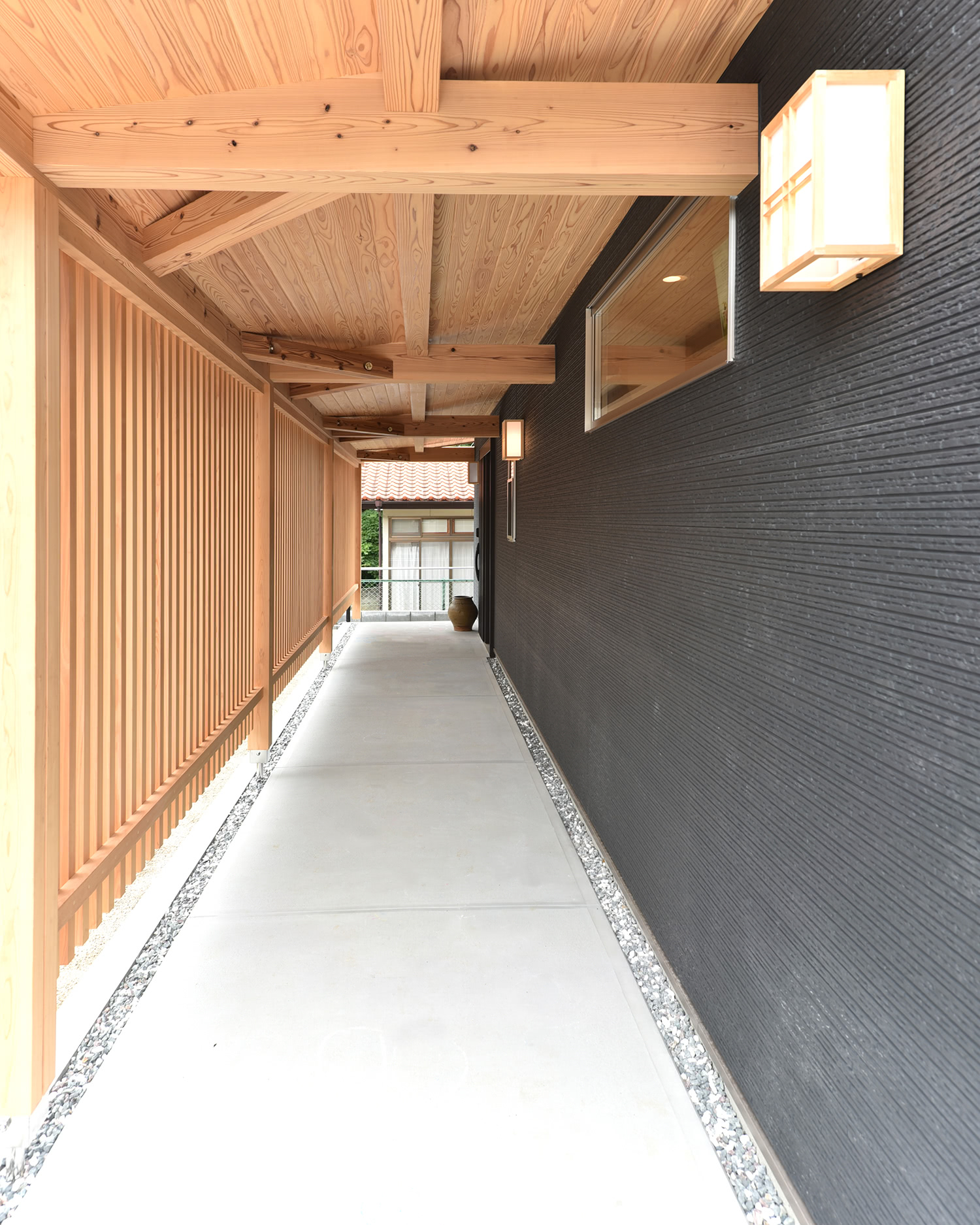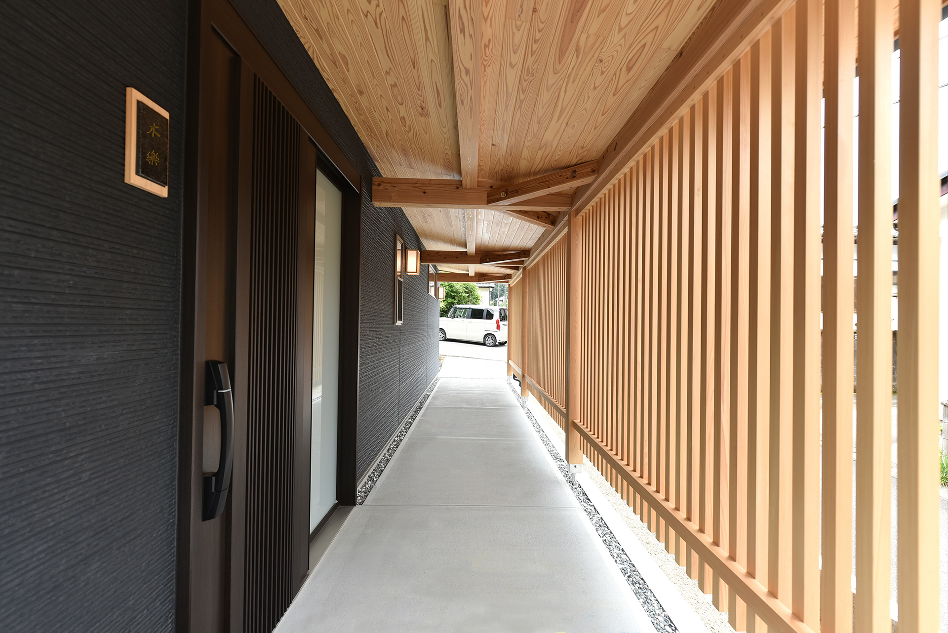 道路からの目隠しを兼ねた木製の縦格子のエントランスアプローチ。まるで料亭か和風旅館のような佇まい。