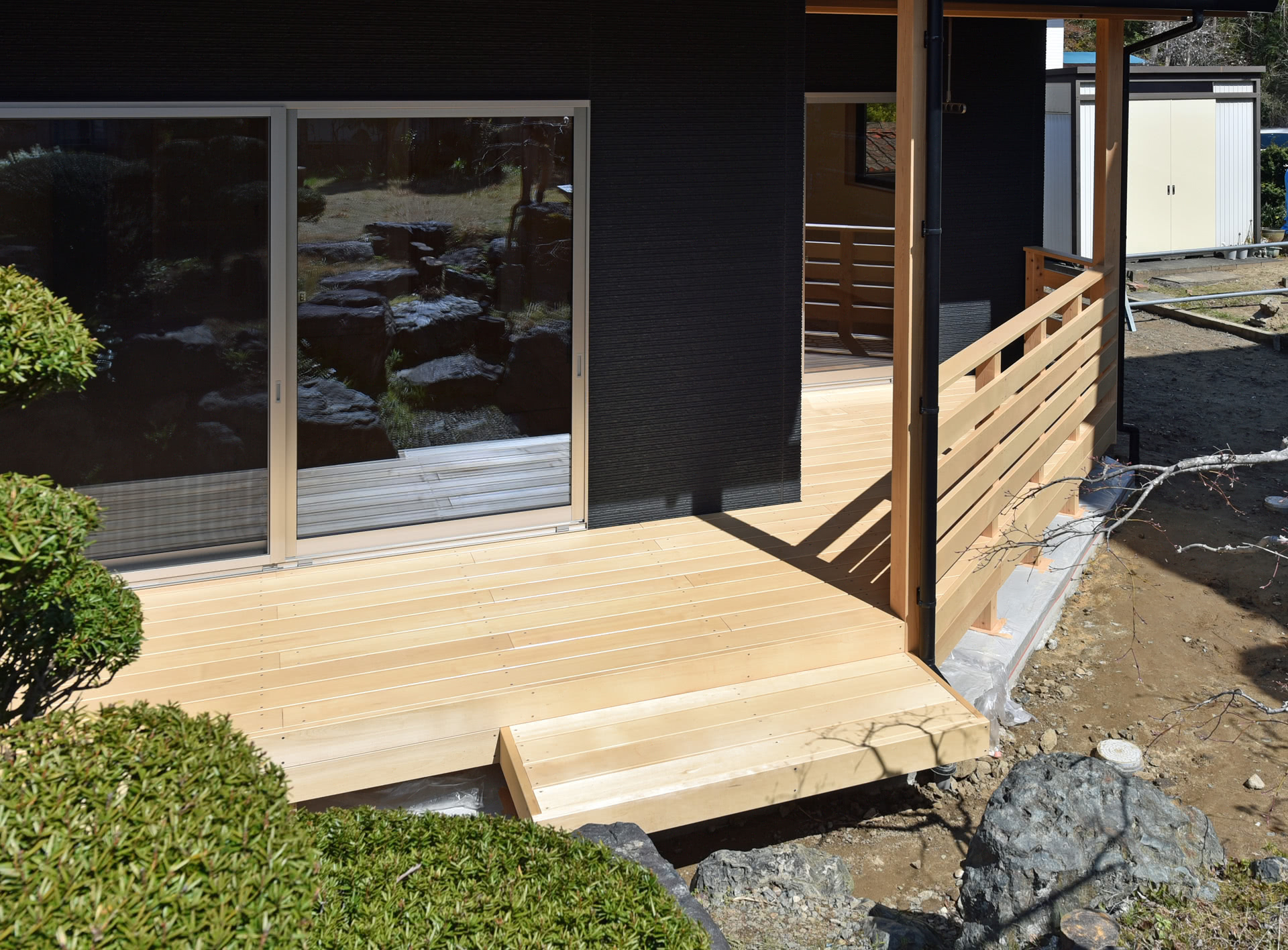 ヒバ製のデッキ。メインデッキとプライベートな洗濯物干しデッキが分かれているのが◎。