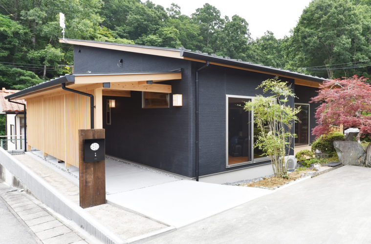 「道路面からの見え方、魅せ方に配慮し、格子の目隠しと玄関までのアプローチに風情を感じられるよう工夫しました。黒い外観に格子やデッキの木の風合いと周囲の山々の緑が映えるいい住まいになったと思います。」と木樂工房。上質な和の情緒を醸し出しています。夜はもっと素敵だそうですよ。