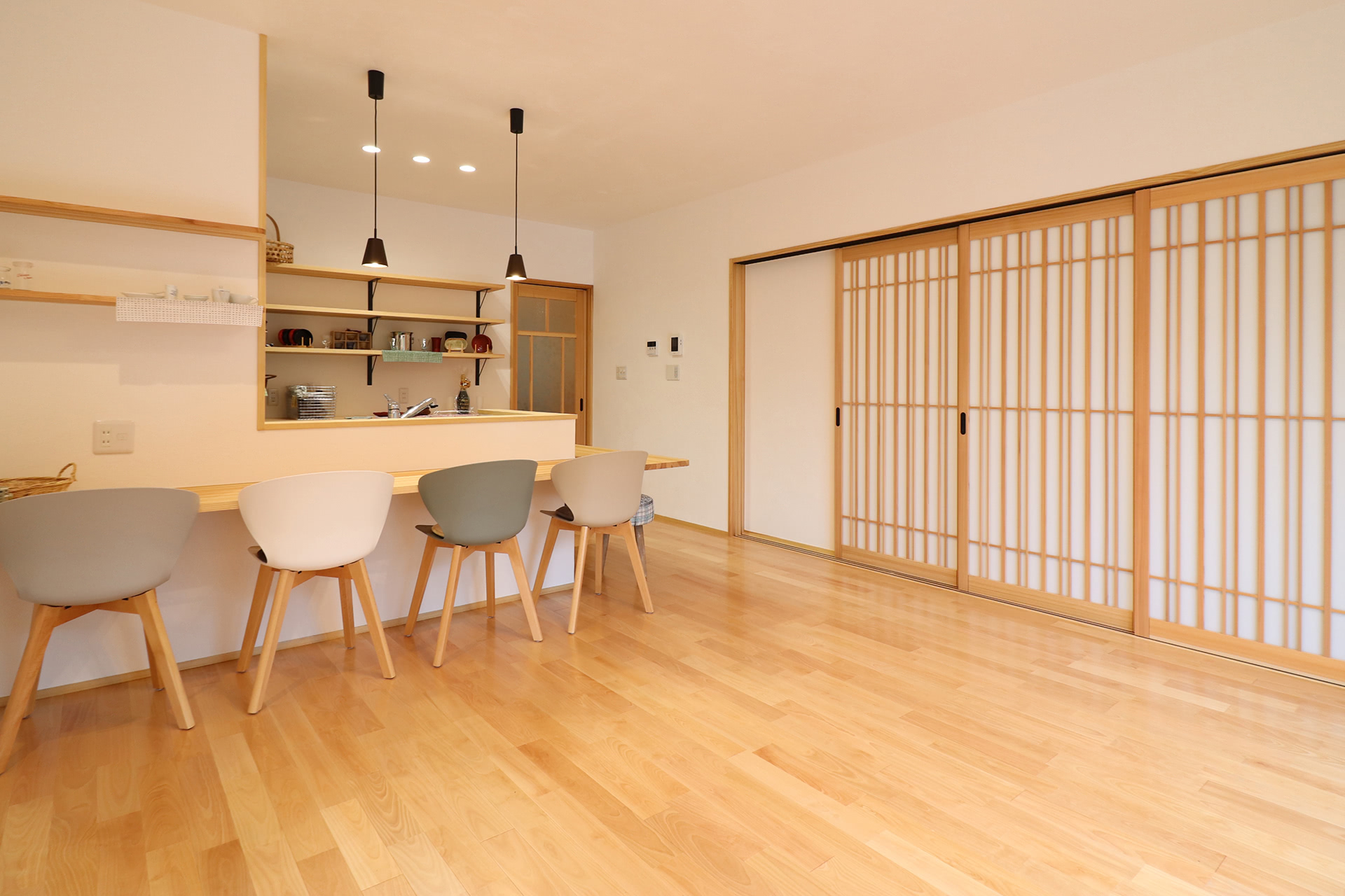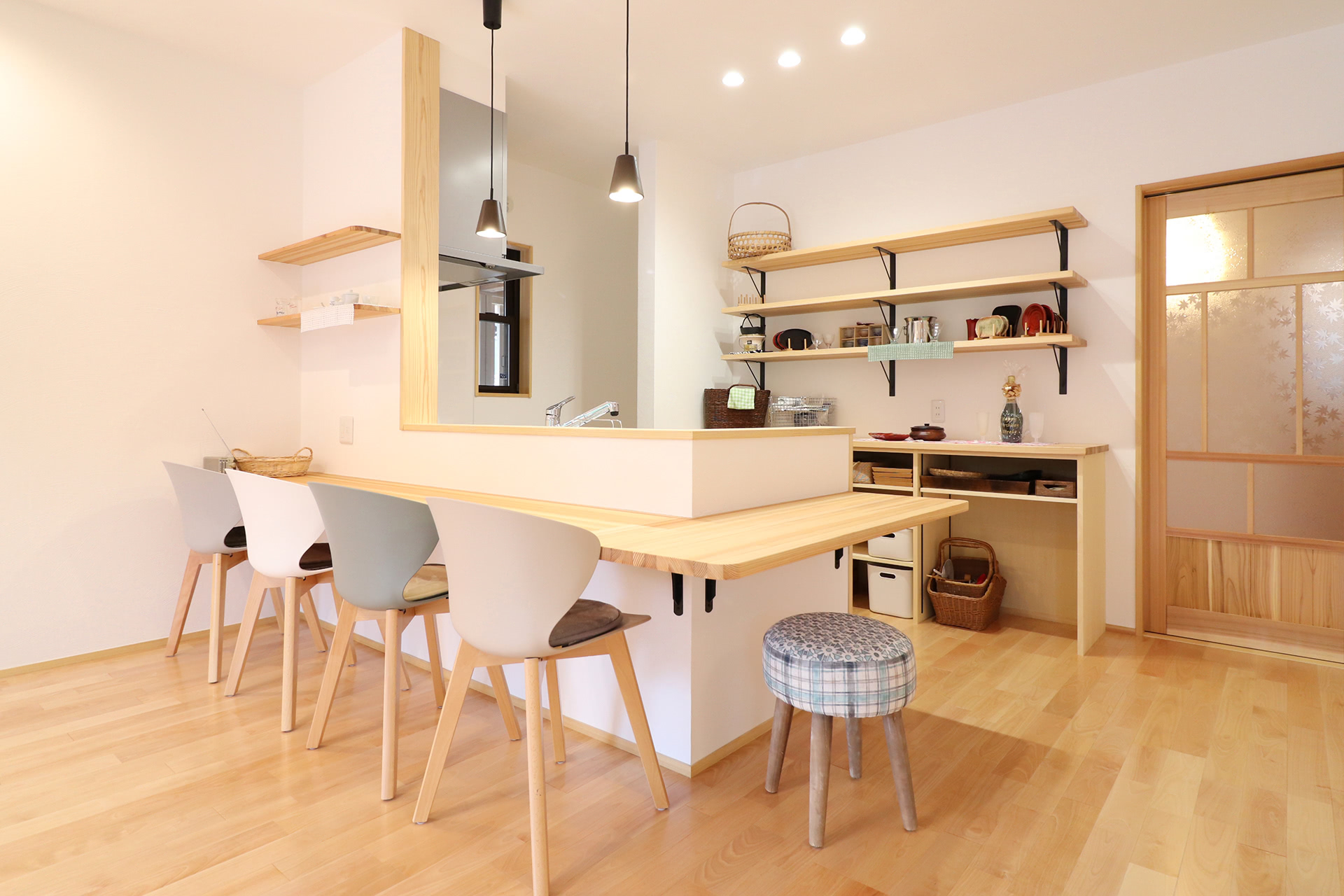 一番気に入っている5人座れるカウンターキッチン。後部の棚は好きな和小物が飾れるような収納棚にしました。
