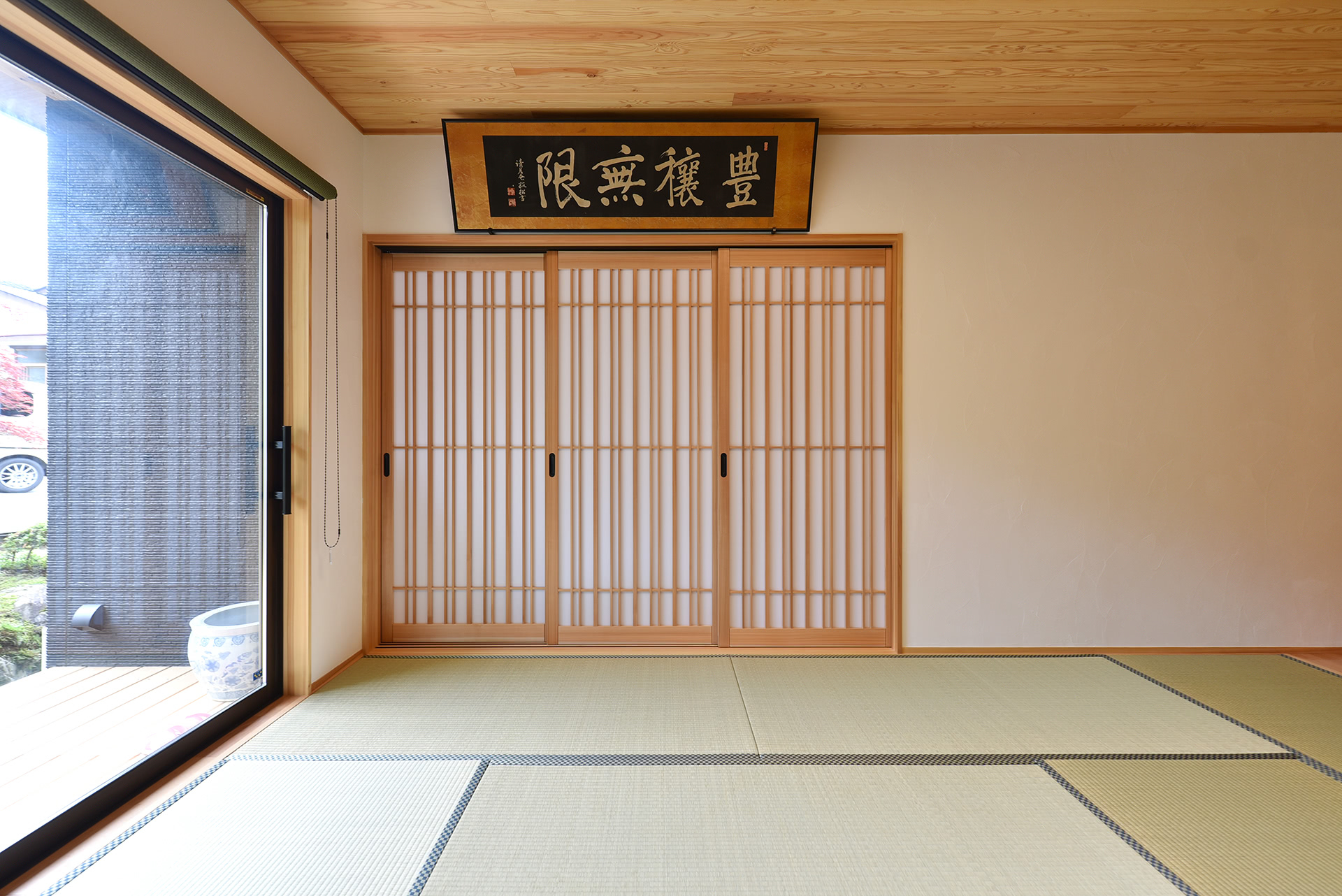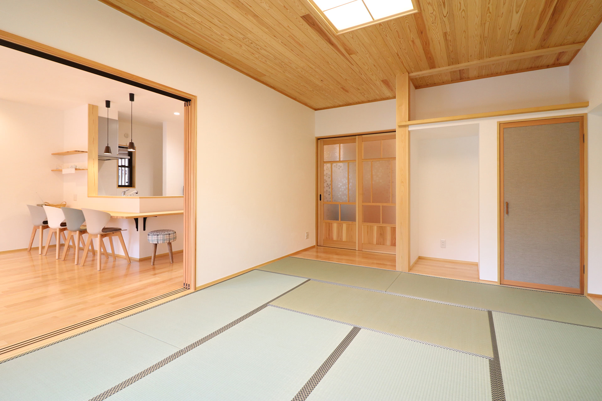 畳縁は建主様お気に入りの市松模様で。天井は杉羽目板。
