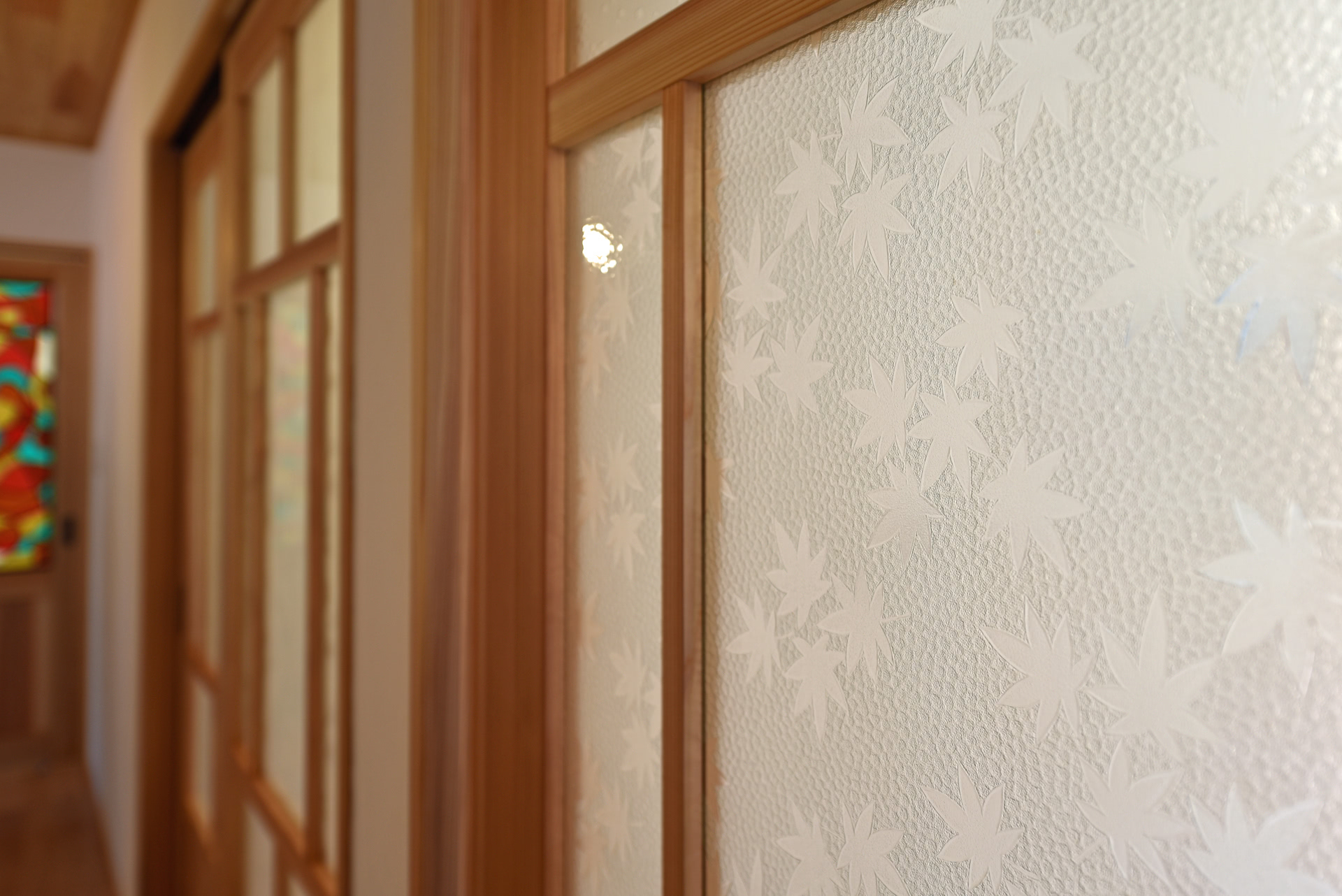 ガラスは以前の家の擦りガラスを使っています。レトロな感じも木の家には馴染みます。