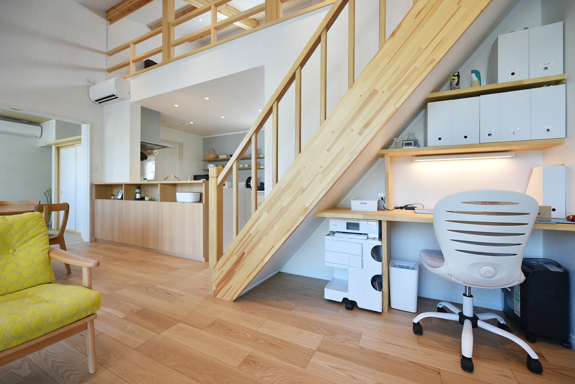 ロフト階段下には家族共用のスタディスペース。
