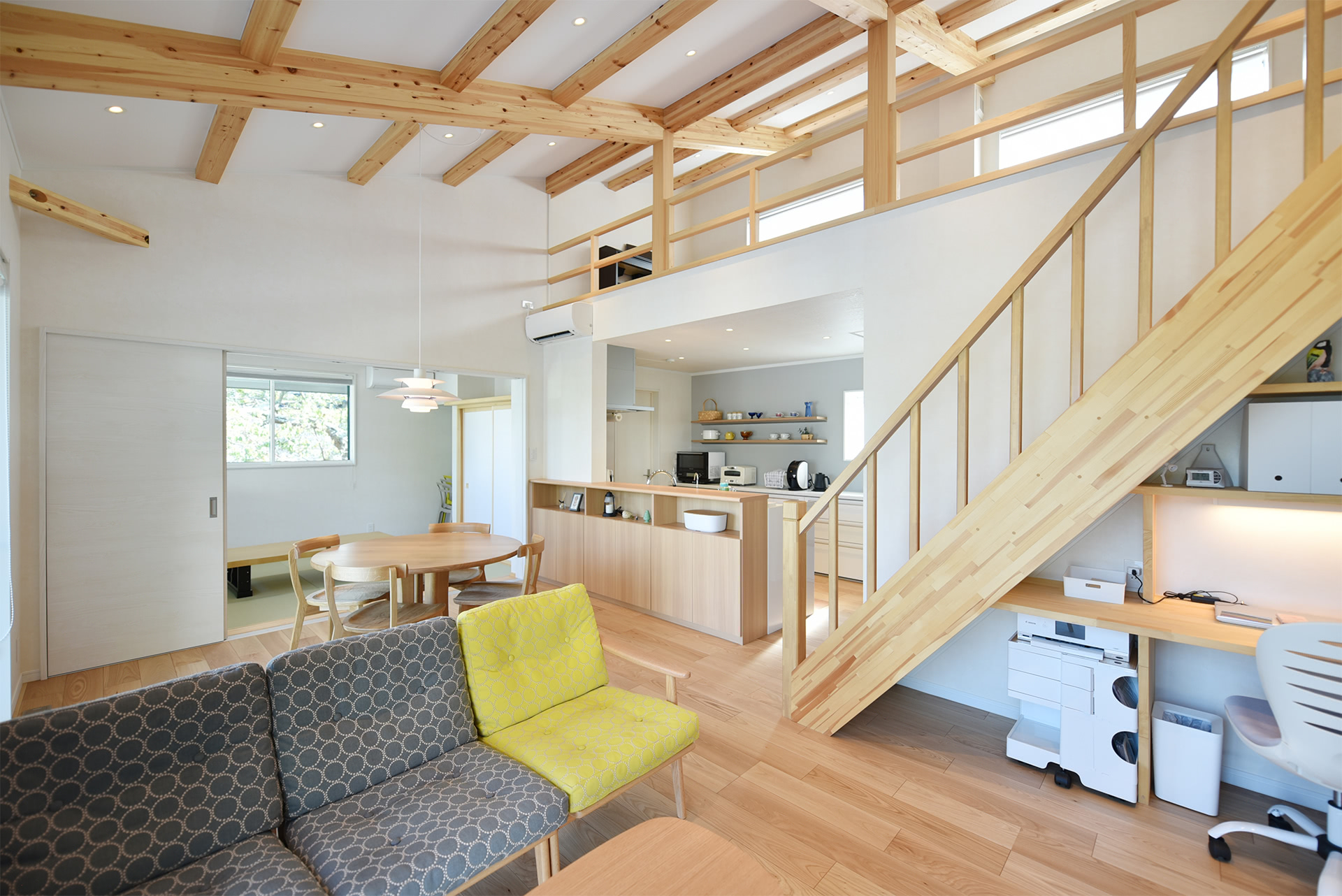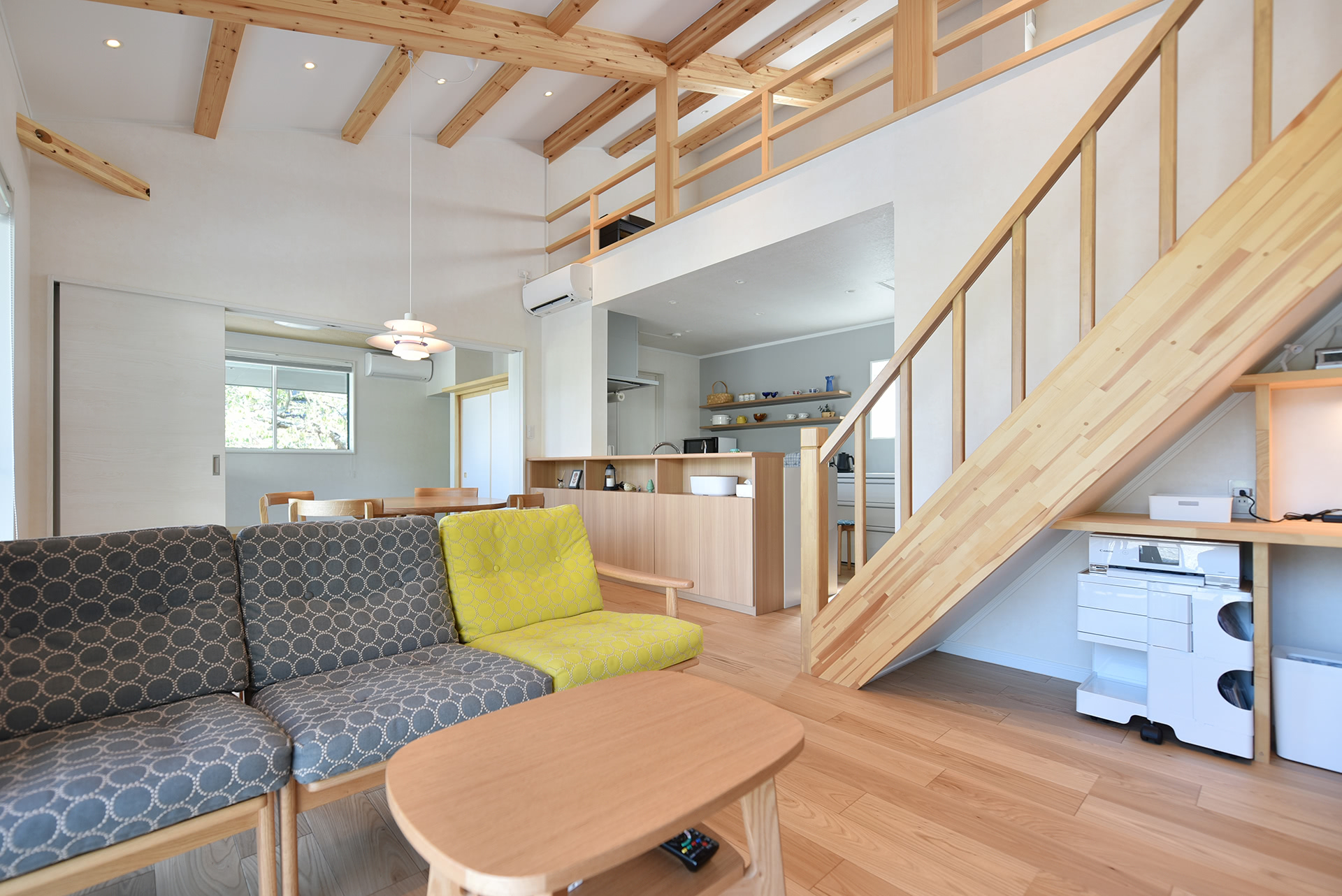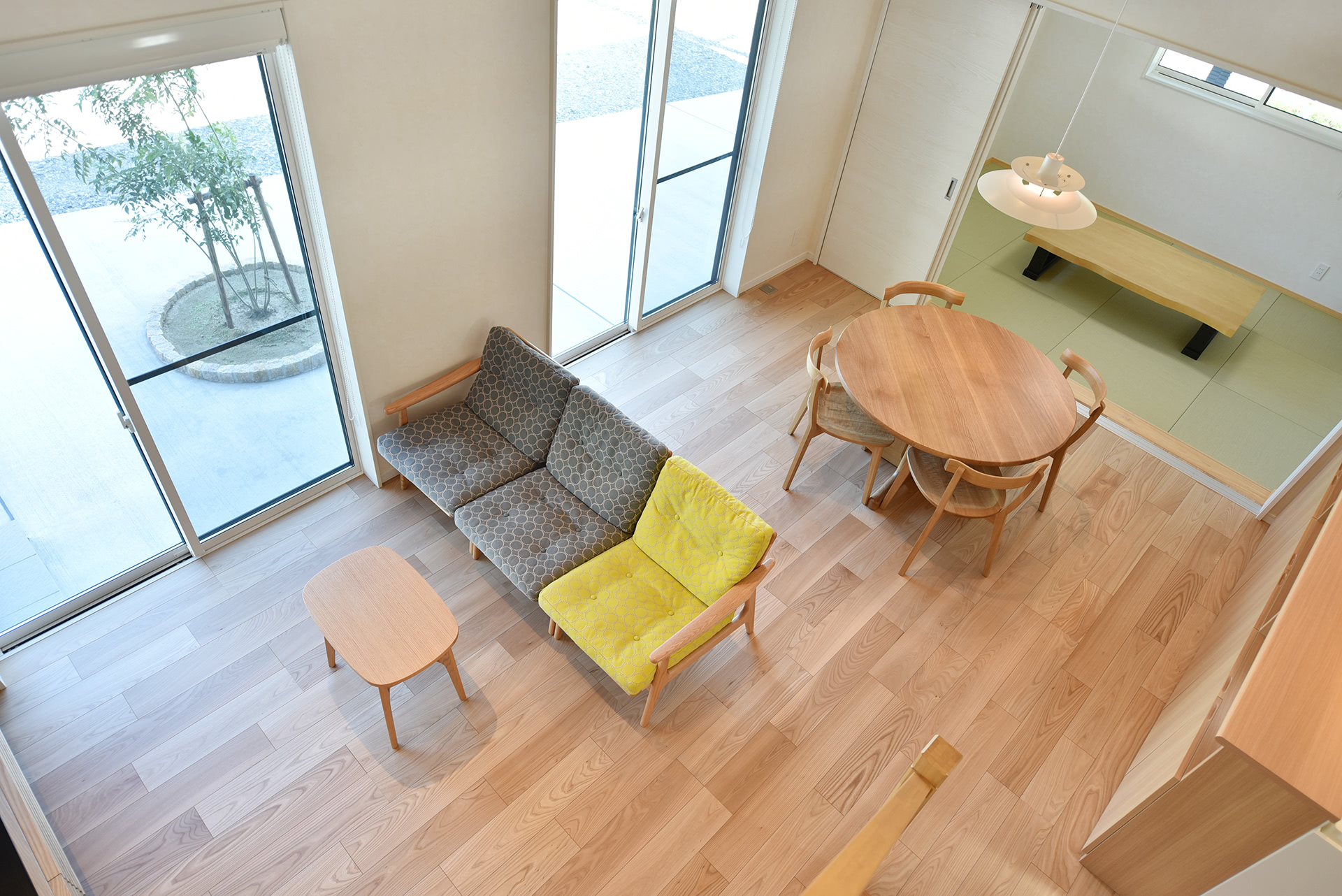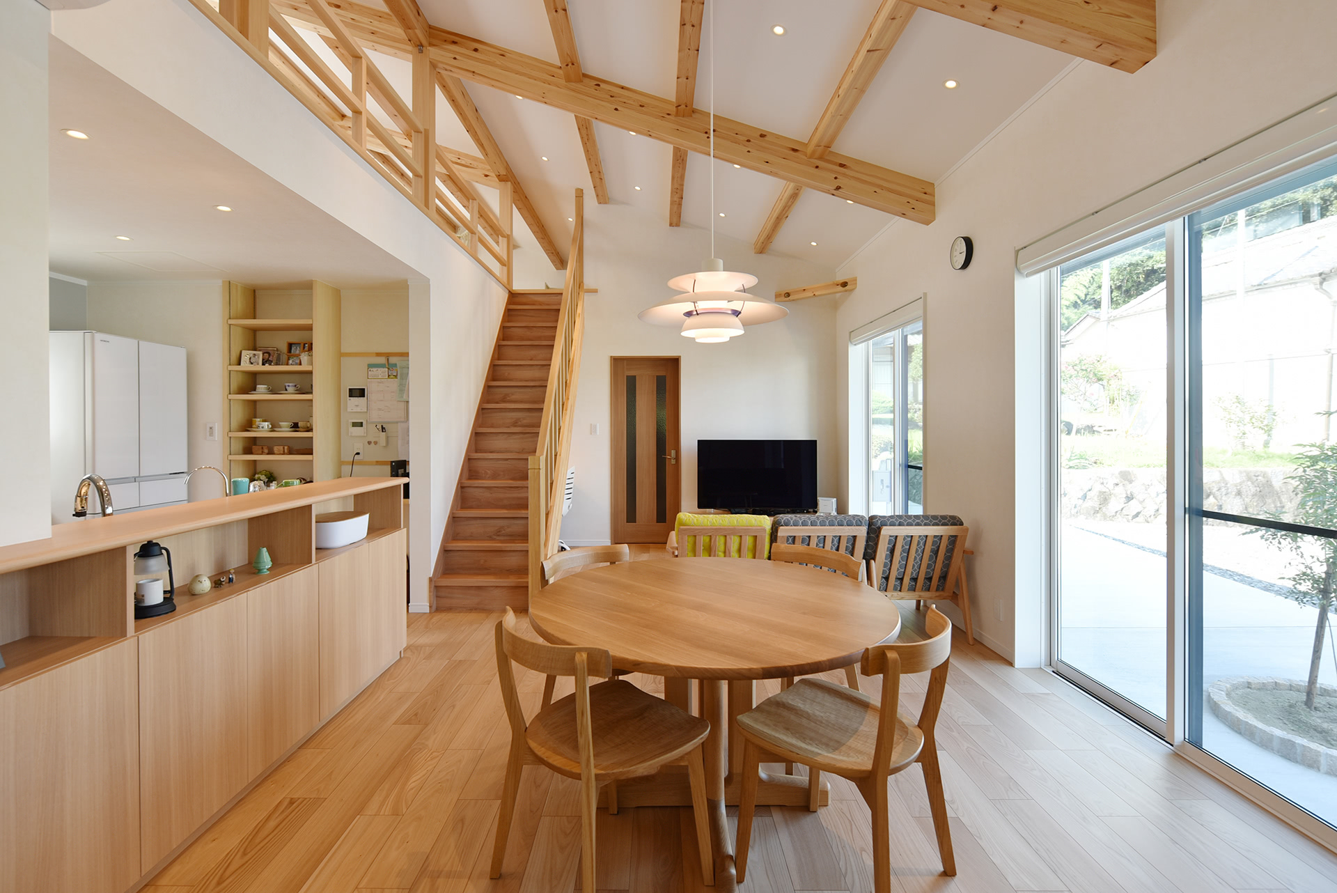 梁現しの勾配天井からの名作照明と丸テーブルもピッタリ調和。白い壁・天井、木部のぬくもりとともに心地よい空間を作り出します。
