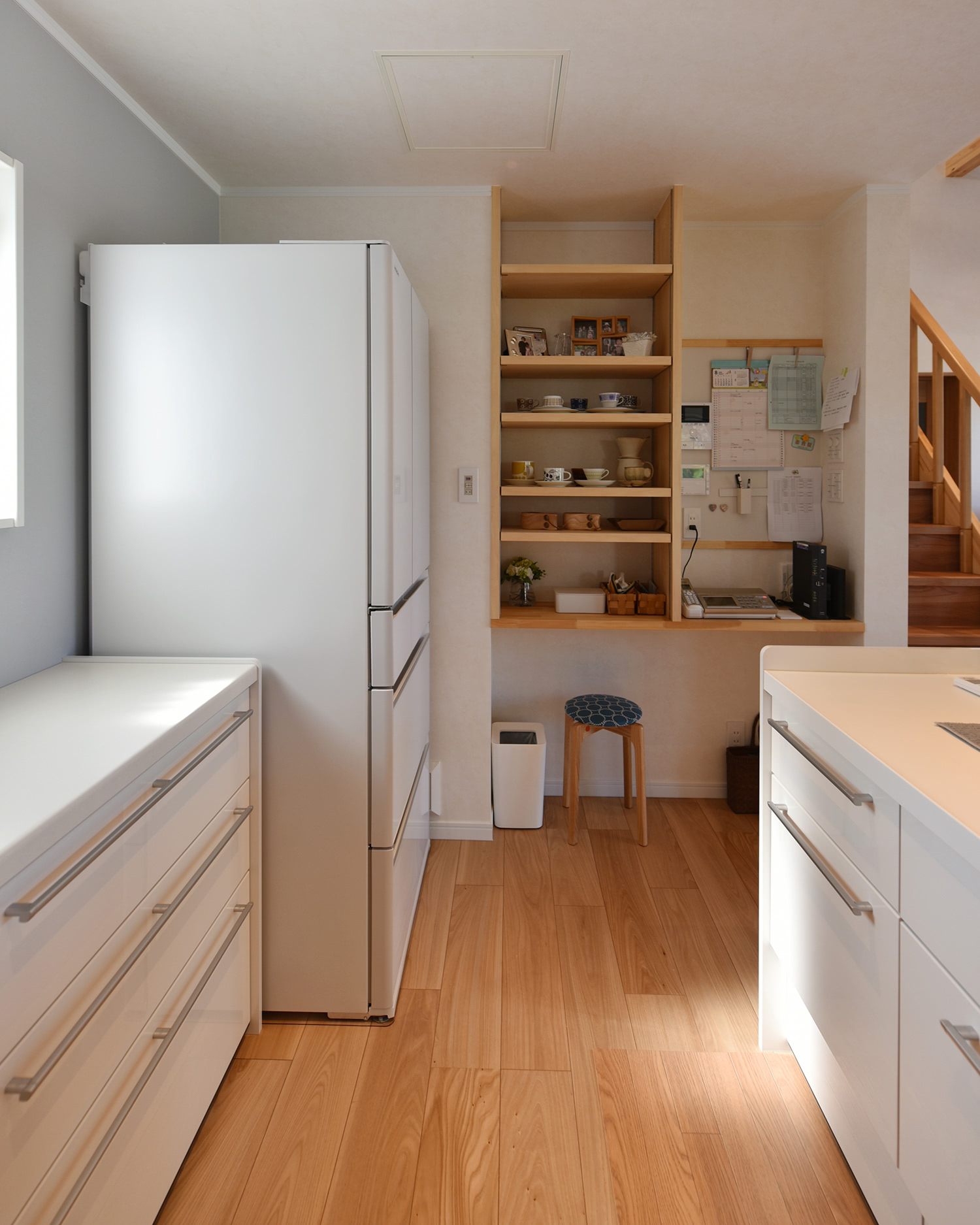 キッチンからパントリー、勝手口、ガレージへと続いています。水やお米など重い荷物も最短運搬。食器や鍋類もパントリーに収納しているのでキッチンはいつもキレイを保てます。