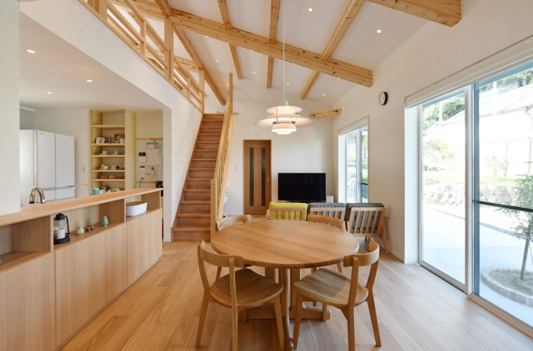 建主様と江尻社長は小学校からの同級生ということで、今回建築を依頼されました。設計は知り合いの埼玉の設計事務所が行っています。50代の建主様は「自分たちが歳を重ねてからも気持ちよくスッキリと暮らせる住まい」を希望されていました。子どもが家を出た後のことを考え建坪は30坪に抑え、生活しやすい平屋にフレキシブルに使える大きなロフトを設けました。和モダンのイメージが強い江尻建築ですが、日本も北欧も木を大切に使うという文化は同じですので、国産の木材も上手に合わせながら、江尻建築らしい木づかいで奥様の好きなシンプルで清潔感のある北欧テイストの家を完成させました。