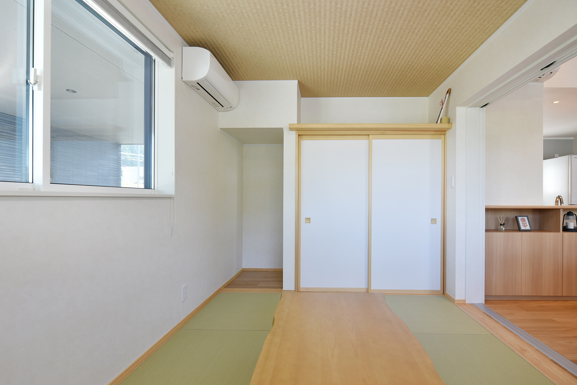 和室は縁無し畳でスッキリとリビングとの繋がりよく。窓の外はガレージです。