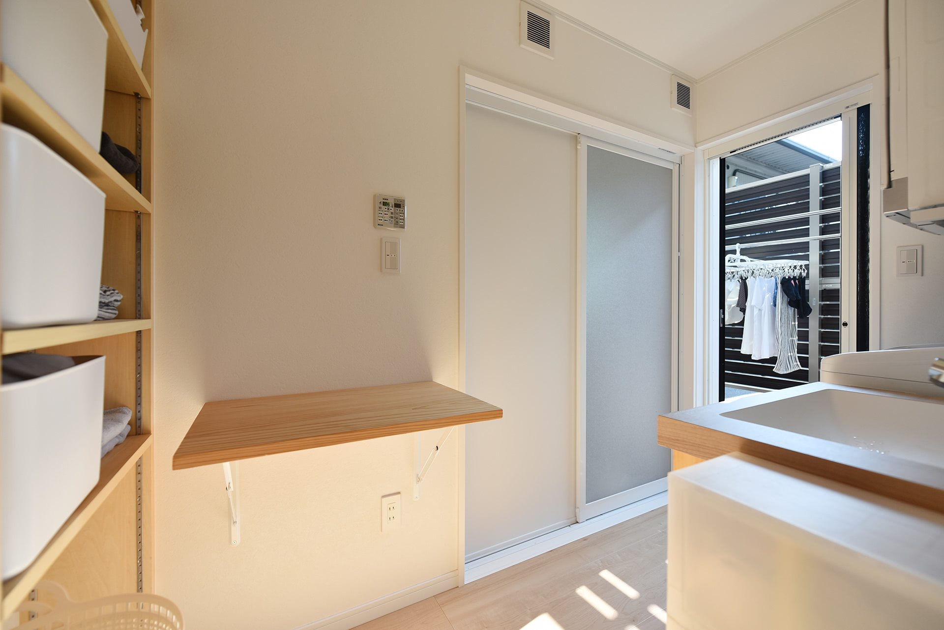 折りたたみ式の作業台も備え付けた洗面脱衣室はそのまま外部洗濯物干し場に直行できます。目隠しの塀もあるので安心して干せます。