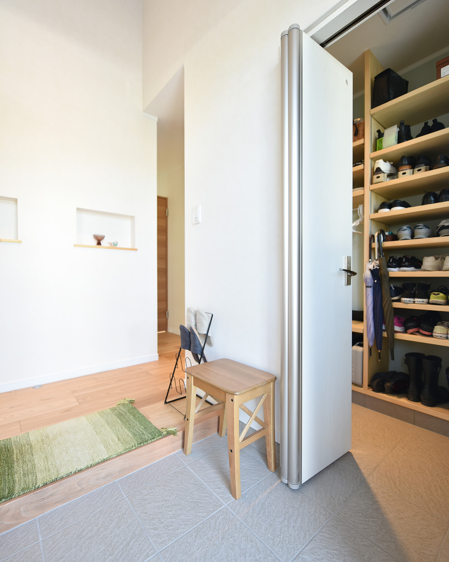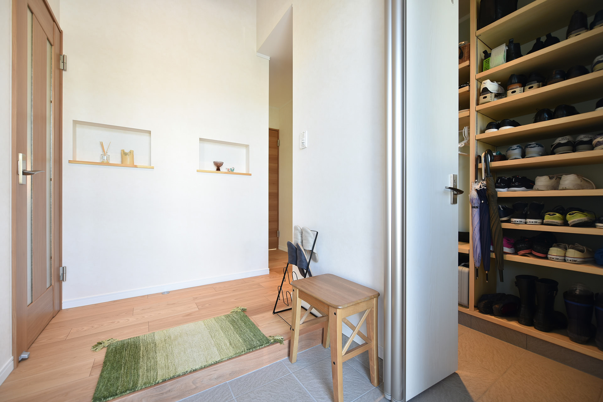 玄関は二手の上り口があります。玄関入って右手が家族の個室へ、左手がLDK。シューズクローゼットは洋服もかけられます。