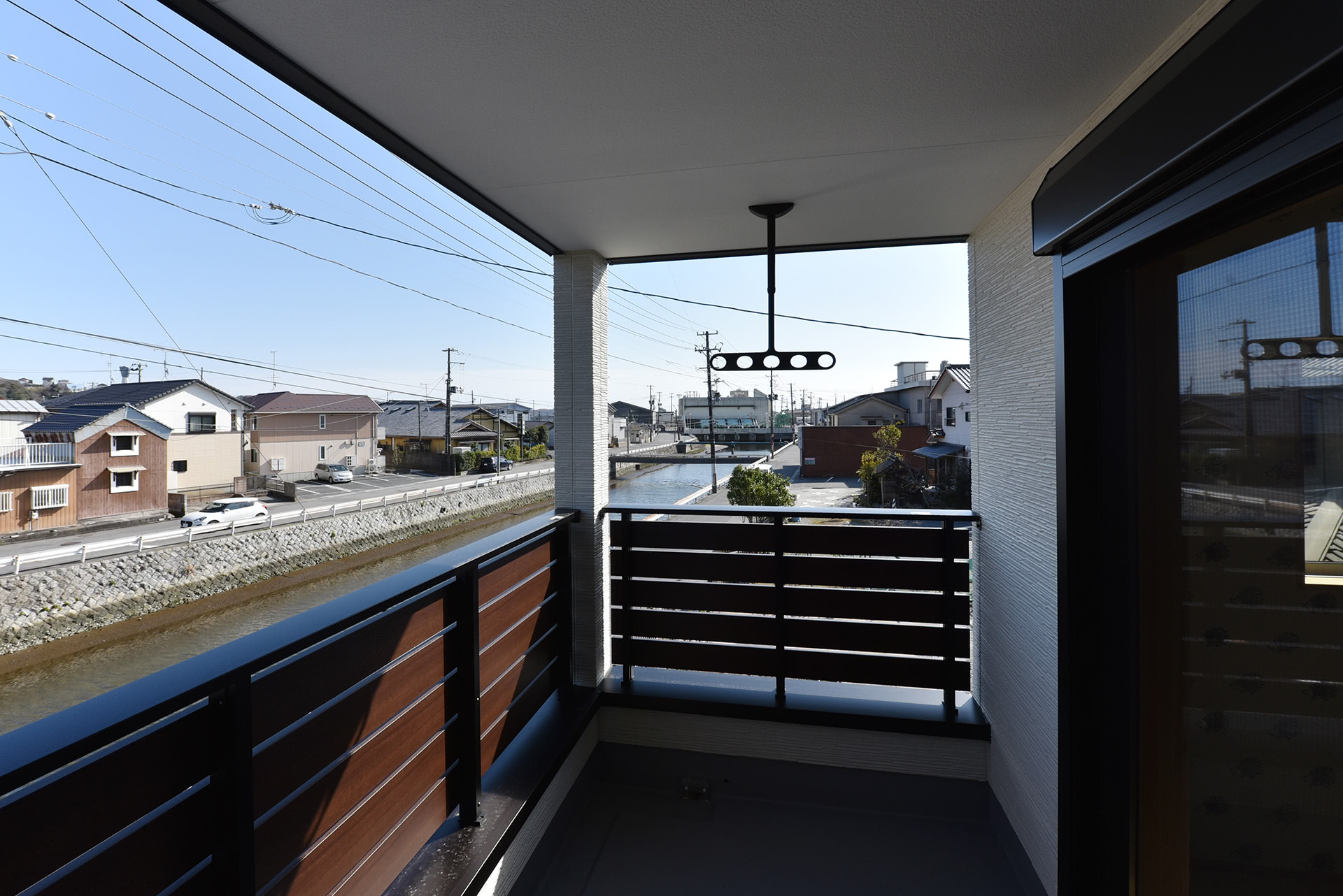 主寝室から小名川リバービューの広いベランダへ。視界が抜けて気持ちがいい。