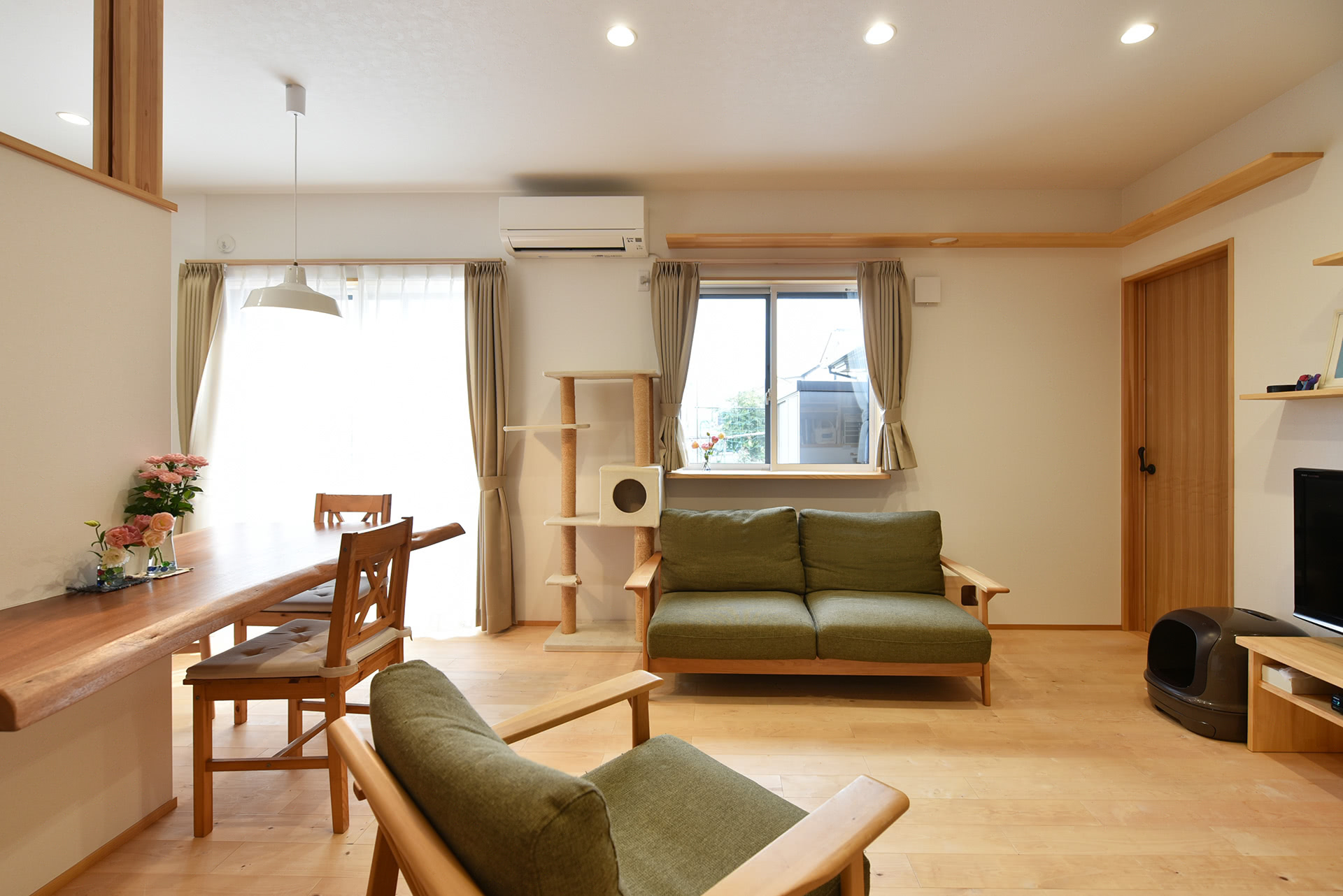 素材はペットの足腰に負担のないよう硬すぎず柔らかすぎない白樺のフローリング、壁はペット対応クロス、猫のトイレ置き場には換気扇を設置するなど、ペットと人がより良く過ごせるよう仕様を考えました。