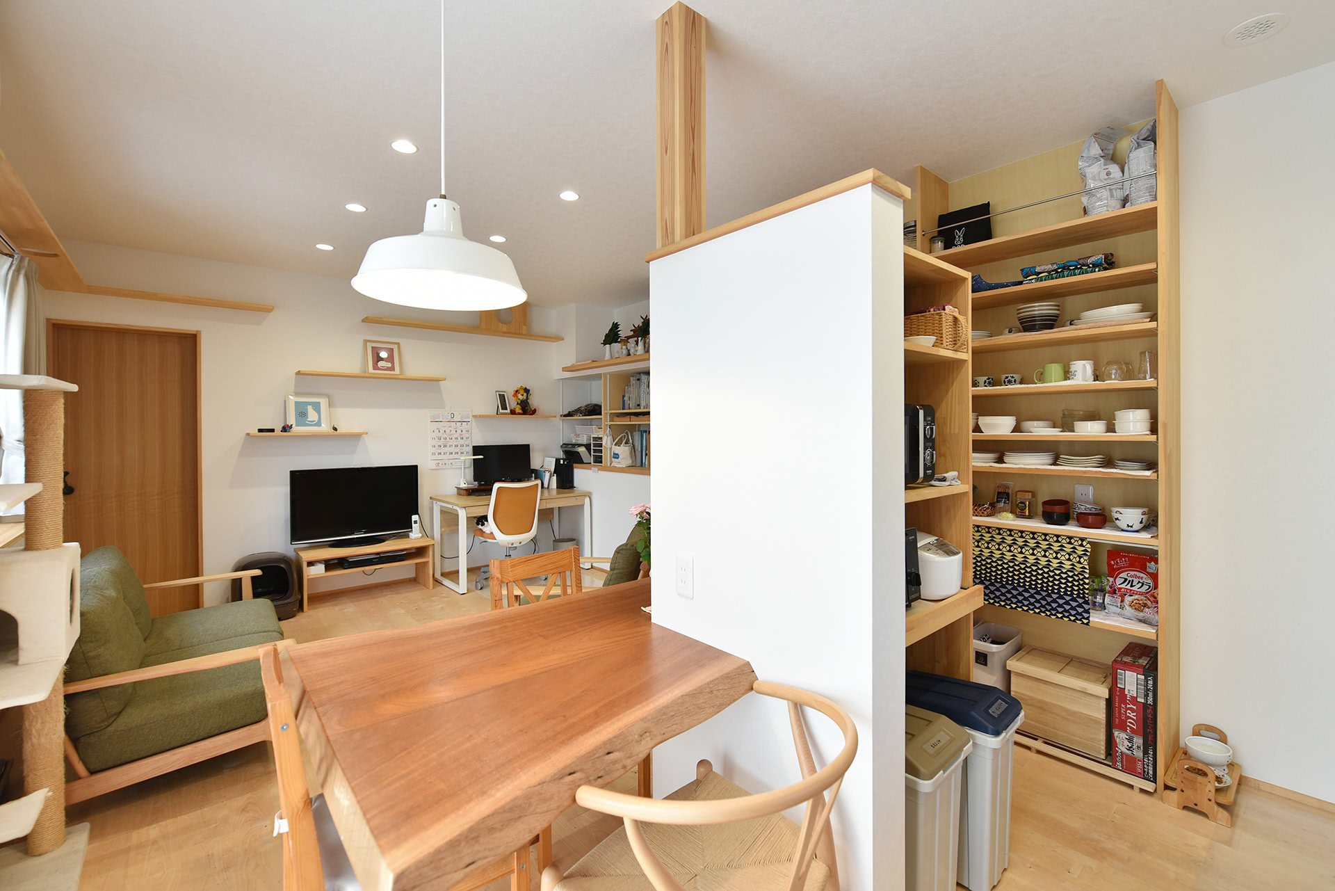犬猫含め家族が多いにもかかわらず収納にそれほどスペースを割いていない印象。足りる?と思いましたが、以前のお住まいのときから物を置かない、増やさないようにしているそうです。プランニング段階で持ち物と暮らしぶりを綿密にリサーチしているのでキッチンも収納もこのカタチでちょうど収まっています。「これ以上物は増やしませんから。」と奥様。
