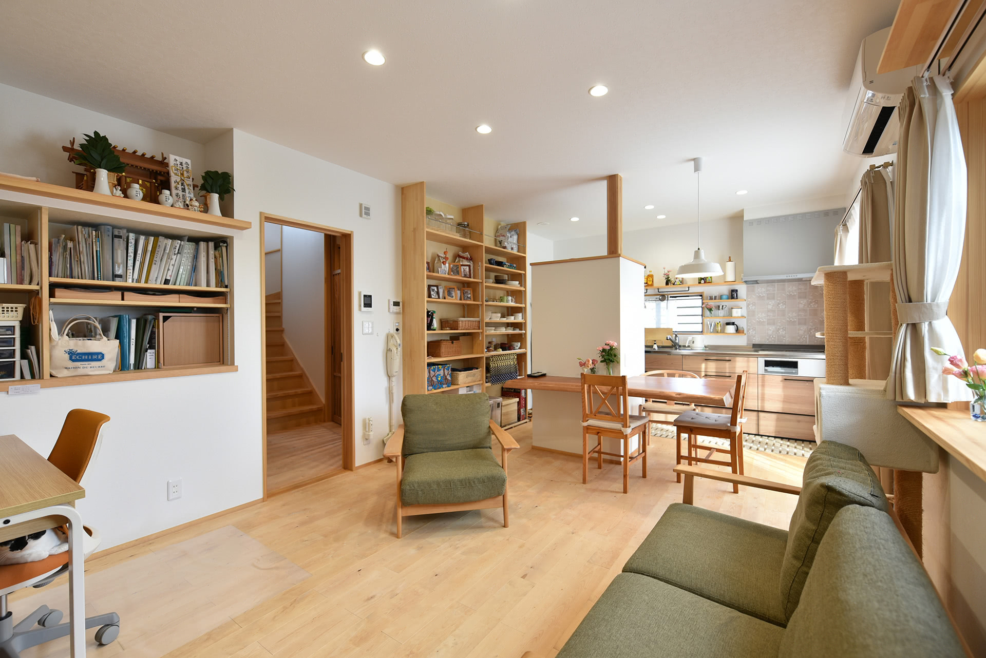 「店舗が地域に開けるよう本町通りからの見え方に配慮しました。店舗部分や駐車場に面積を有したので住居部分はコンパクトなつくりですが、お施主様の暮らし方が明確だったので提案もしやすかったです。キャットステップやピクトグラム、壁に埋め込んだ一枚板のテーブルなどの提案も喜んでいただけて楽しくつくることが出来ました。