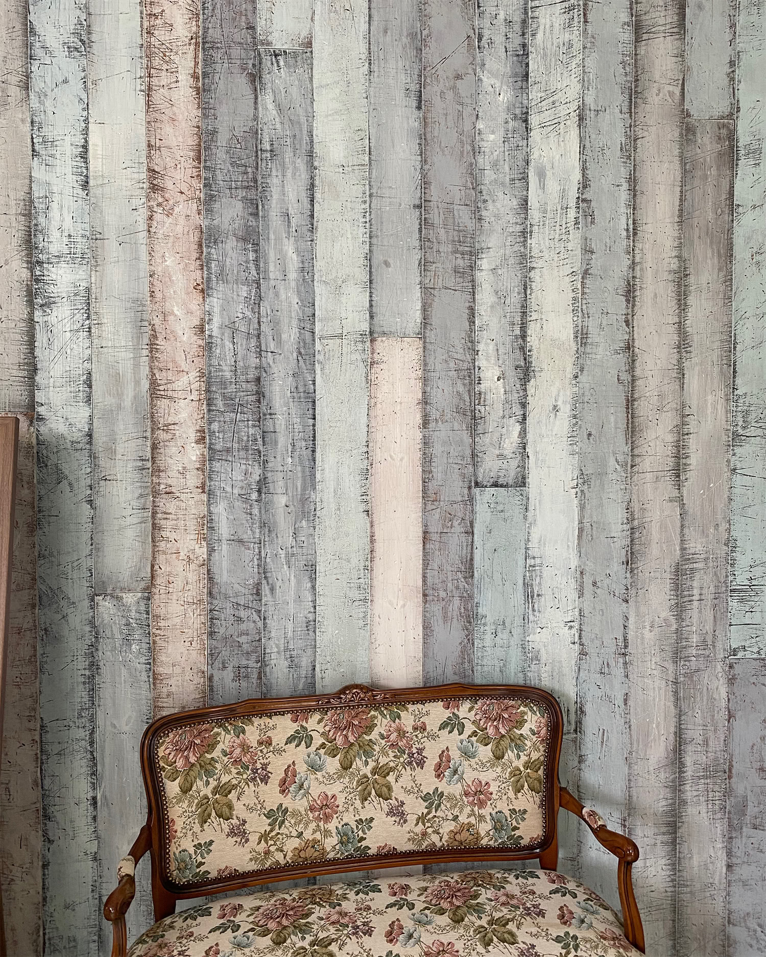 シャビー具合が絶妙な壁。木樂工房で加工した無垢パイン材とのこと。「様々な手法を使いエイジングを施しました」とのことで、映えます!