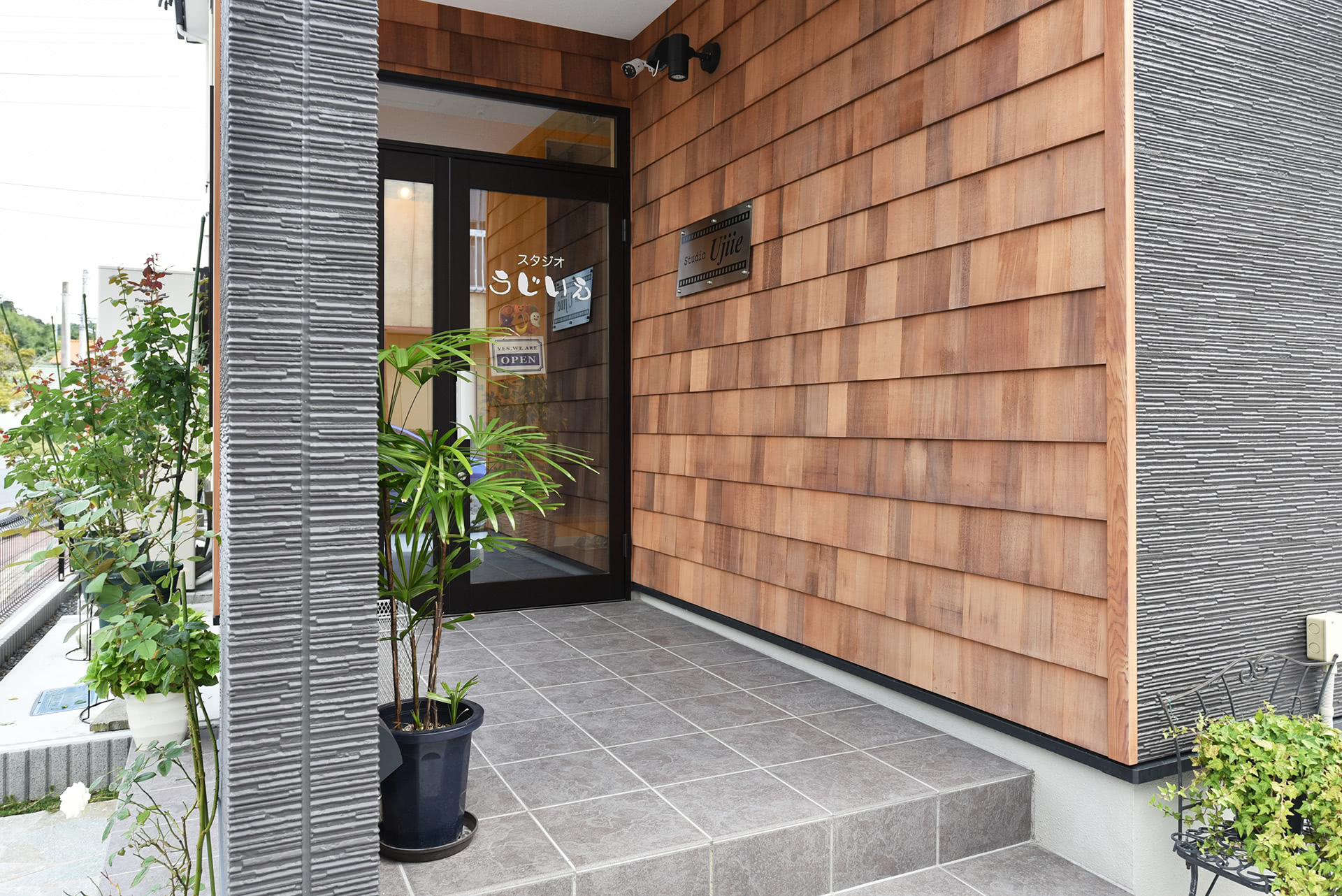 レッドシダーのパネルをアクセントに加えることで店舗らしく。道路と建物の間に植えた奥様のバラが育つのが楽しみ。