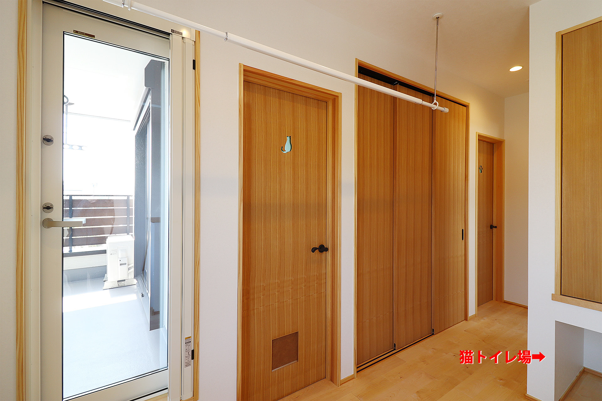 廊下からもベランダへ行き来可能、室内物干しと猫のトイレ場(換気扇付)もあり、スペースを無駄にしない工夫。