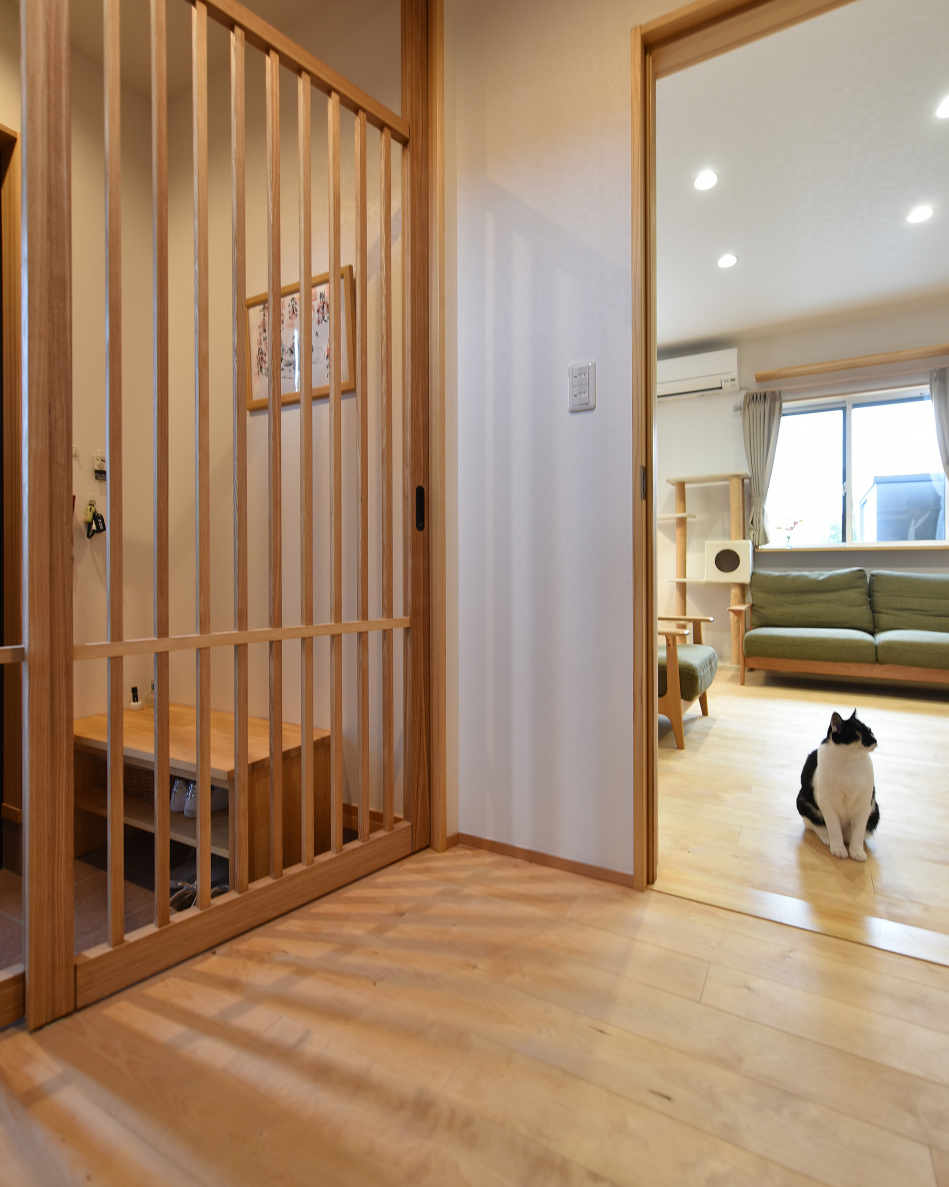 玄関を入るとまず格子戸がお目見え。「猫たちの脱走防止用につけてもらいました。目の前が車の多い通りだからこれがあると安心です」。それに加え和モダンの雰囲気を演出する役割もありますね。
