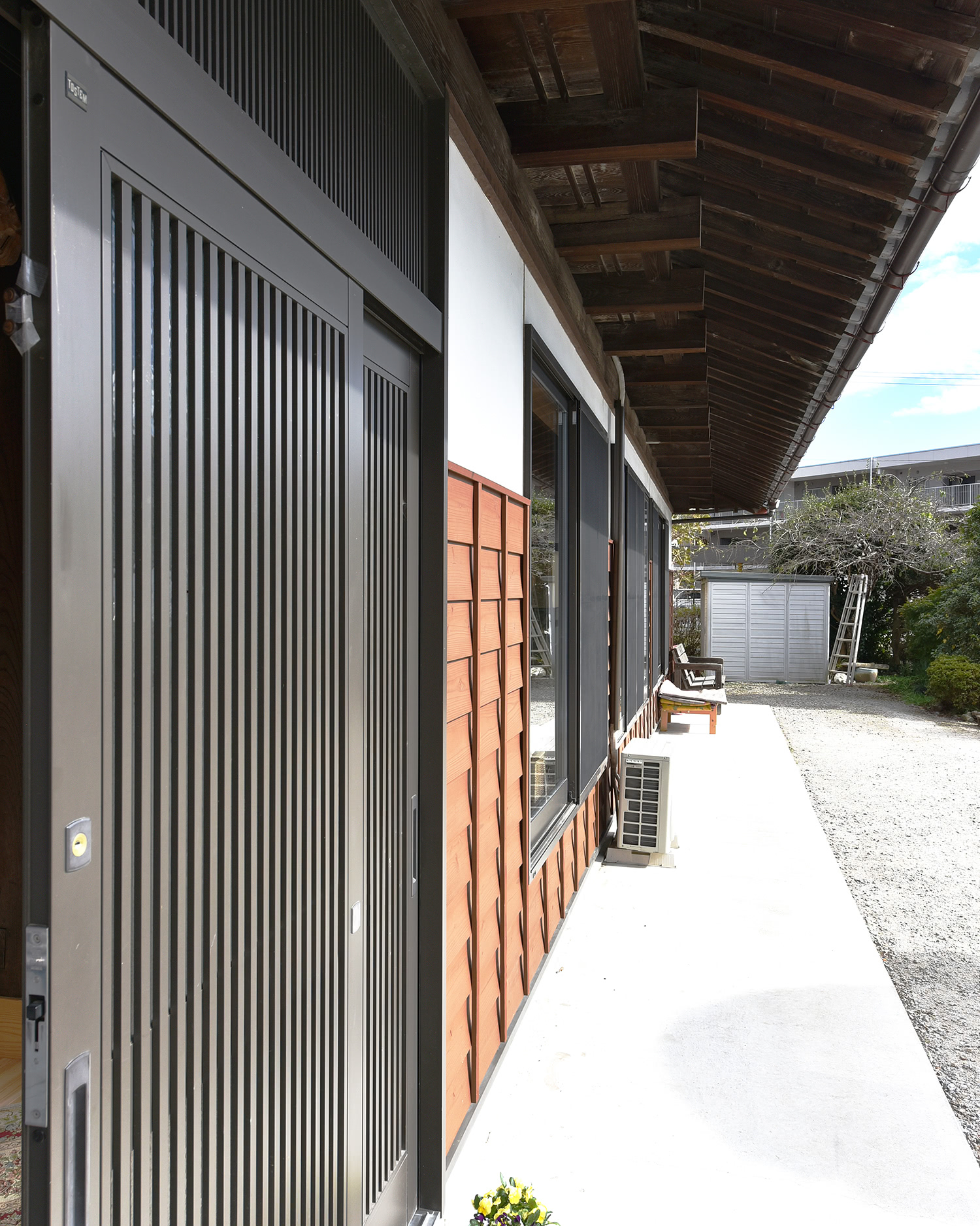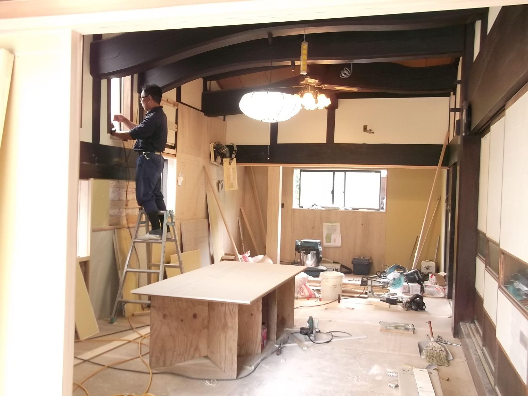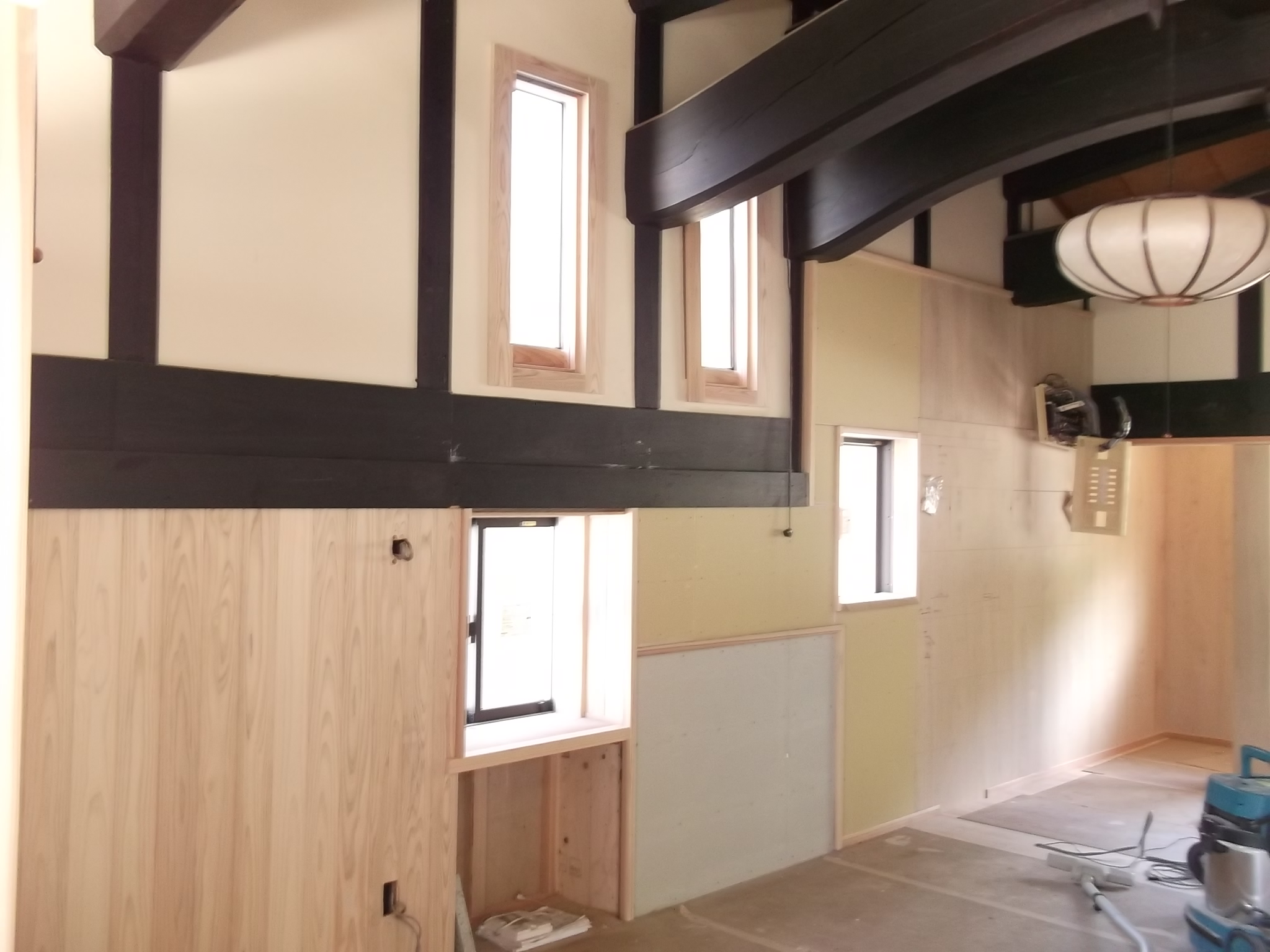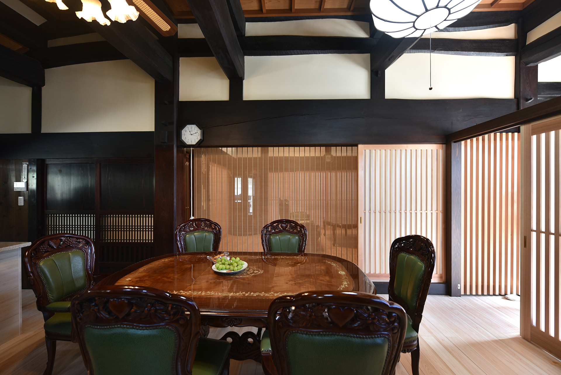 大きな古民家の改修は大変じゃないですか?と秋山社長にお聞きすると「仕事としてやることですので大変なことはありません。屋根裏の100年分のホコリはさすがに真っ黒になりましたけど。立派な梁と骨組みをどう活かすか、そこに奥さんの趣味をどう入れ込むかは慎重に検討しました。再利用できる材は再活用し、暮らしやすい大きさに減築しました。」と秋山社長。