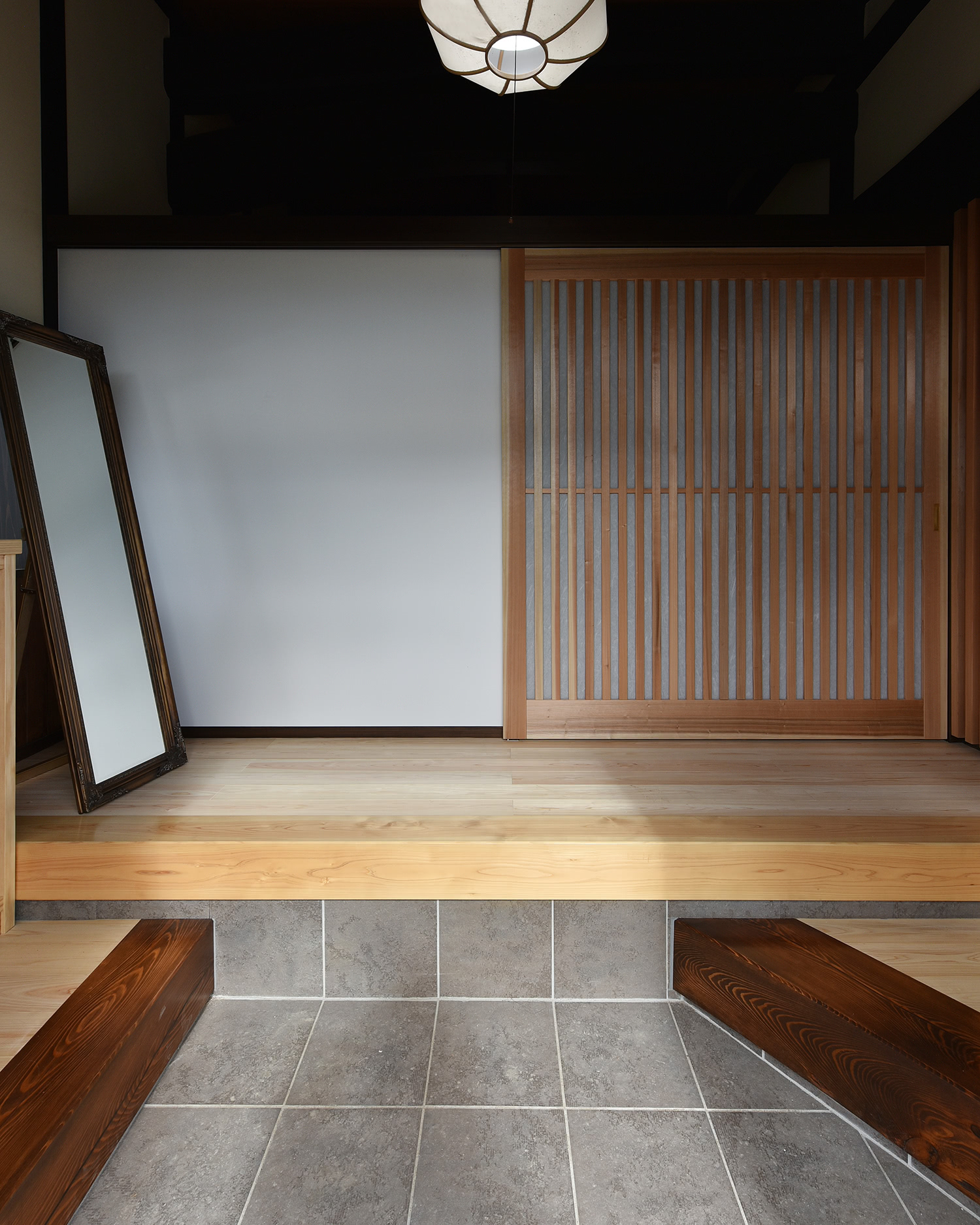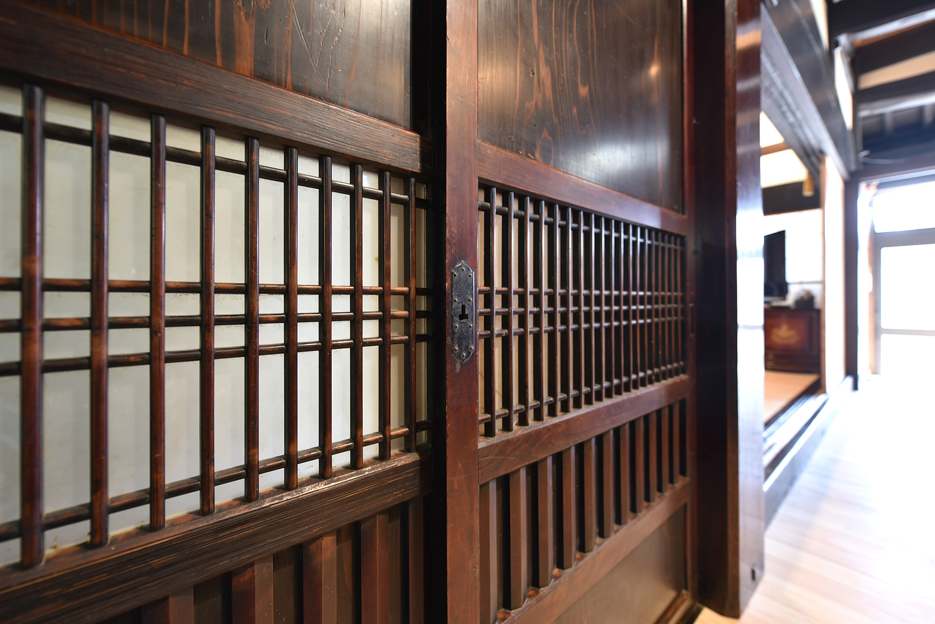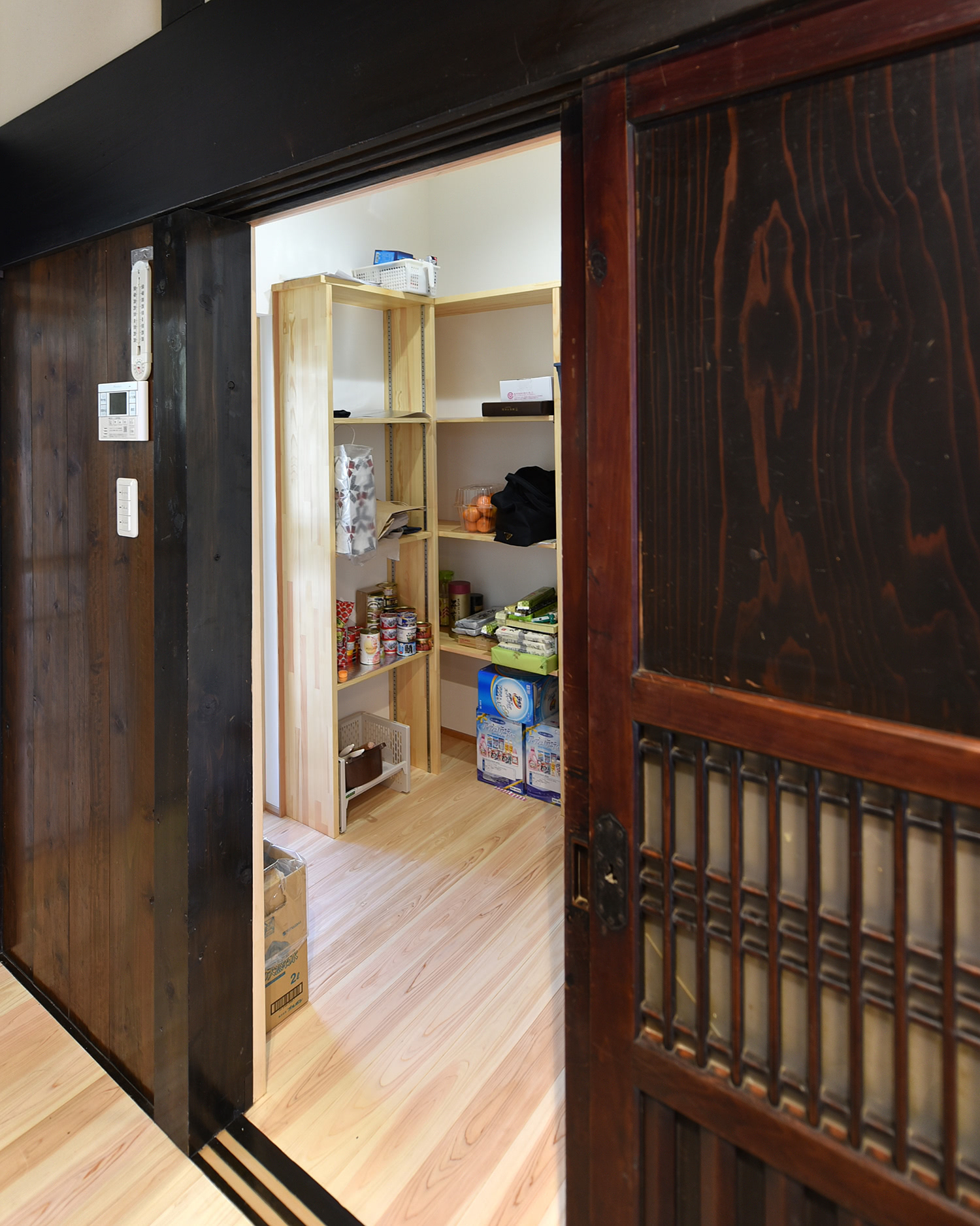 奥の襖は改修前から気に入って使っていたもの。床材はすべて無節の桧です。