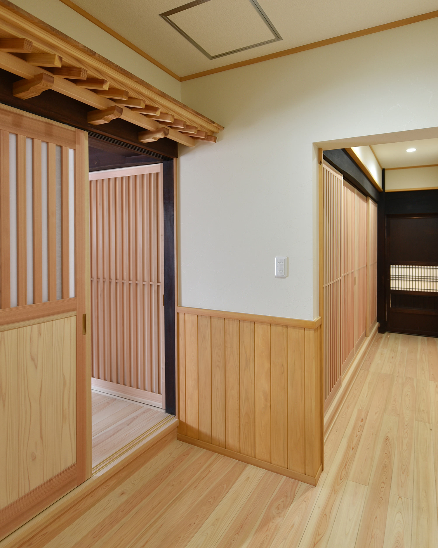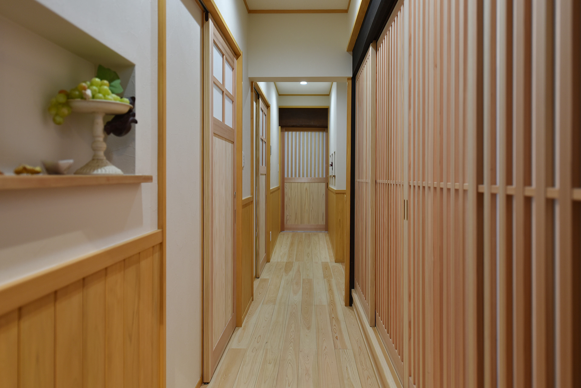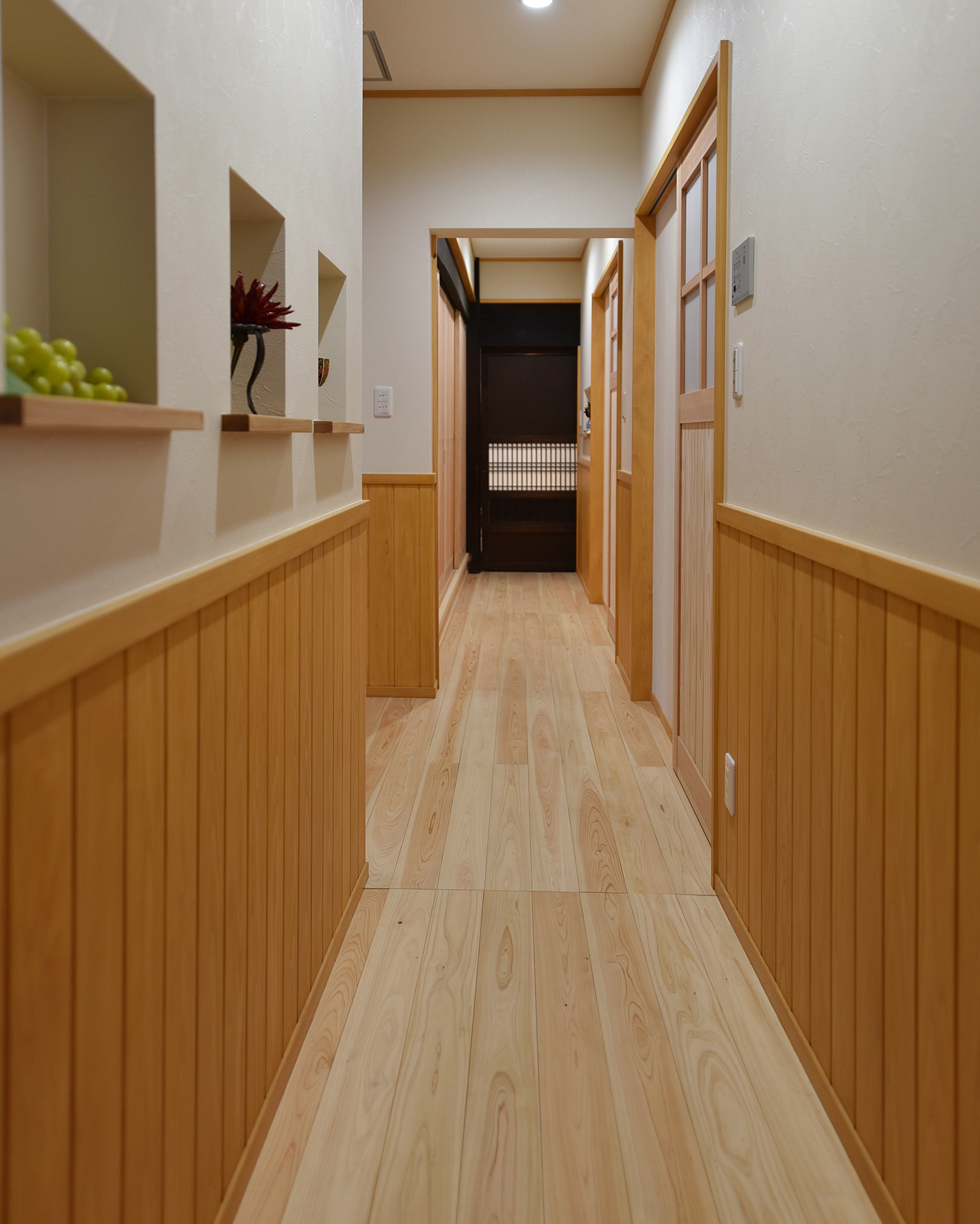 もう片方を開けると廊下。無垢材がふんだんに使われています。