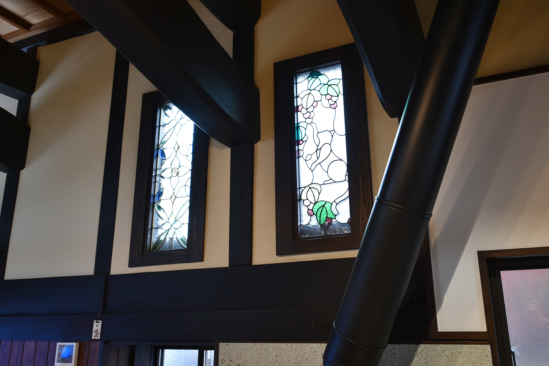 建主様と丸徹住建とはそもそも面識は全くありませんでしたが、「信頼できる人に相談したら、紹介されたのが丸徹住建の秋山社長でした。大手リフォーム業者とも進めていましたが、お話するうちに実直な印象の秋山さんにお任せすることにしました。以前訪れた山荘に薪ストーブとステンドグラスがあって、とても素敵で気に入ったのでそのイメージでお願いしました。」と奥様。