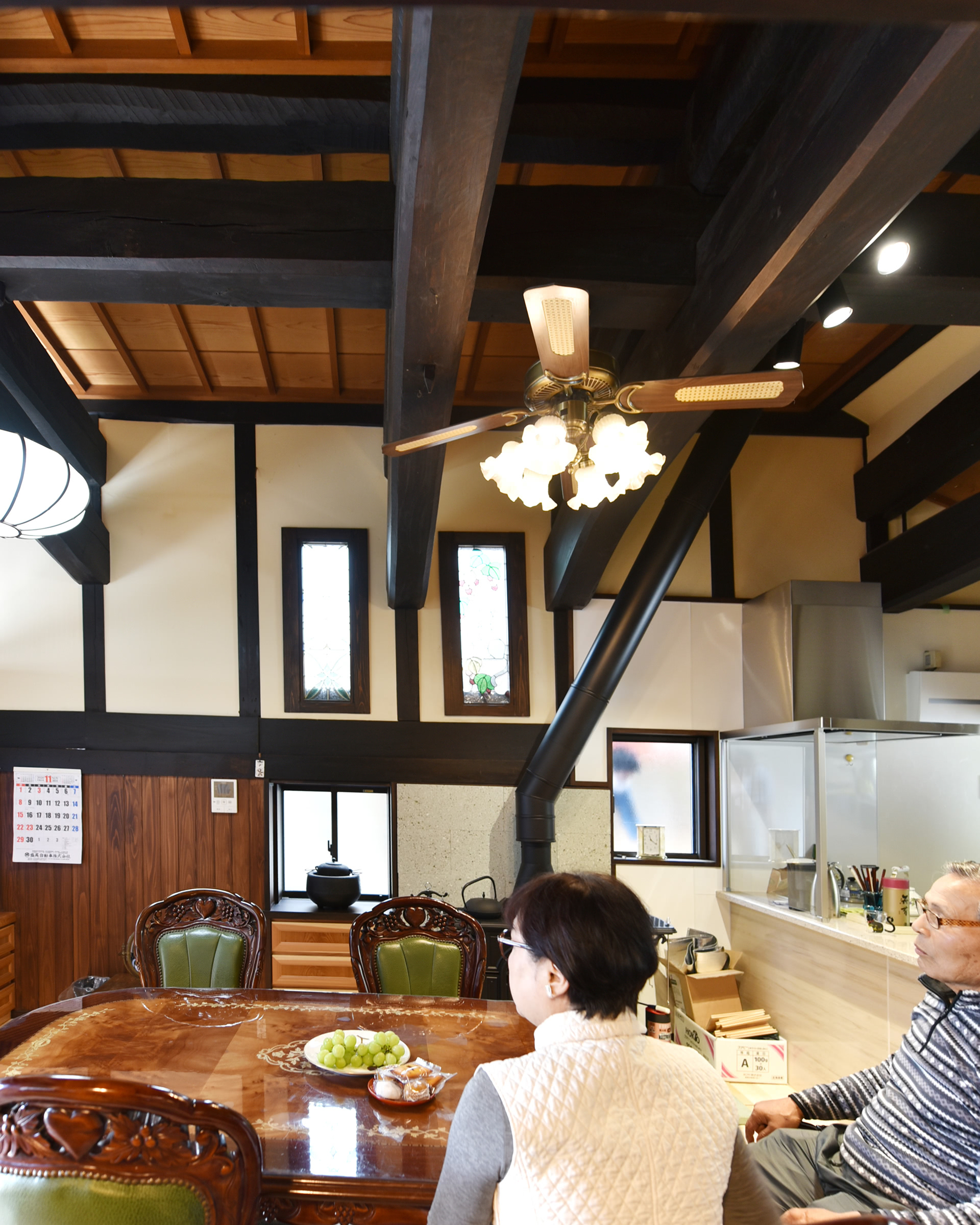先代が裏山から切り出した松の梁に見守られながら暮らす。