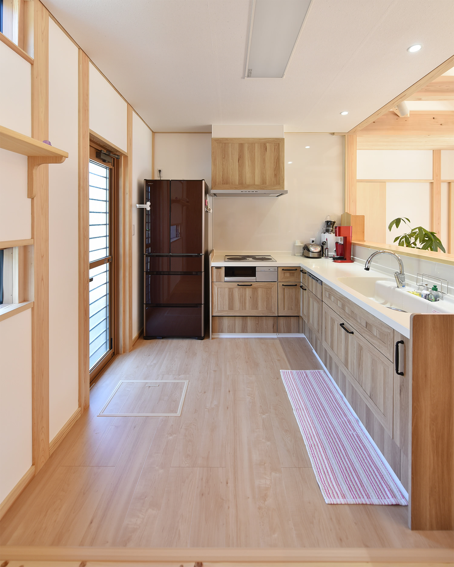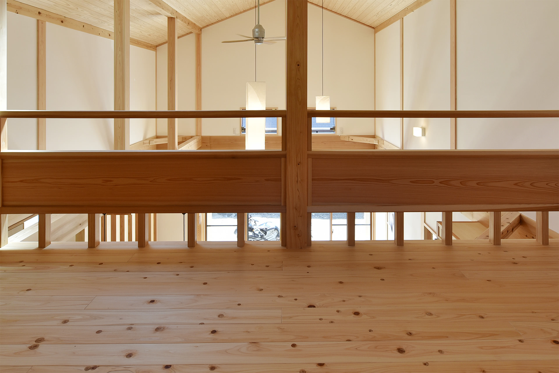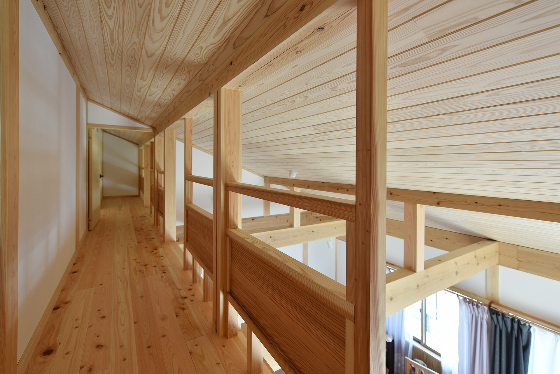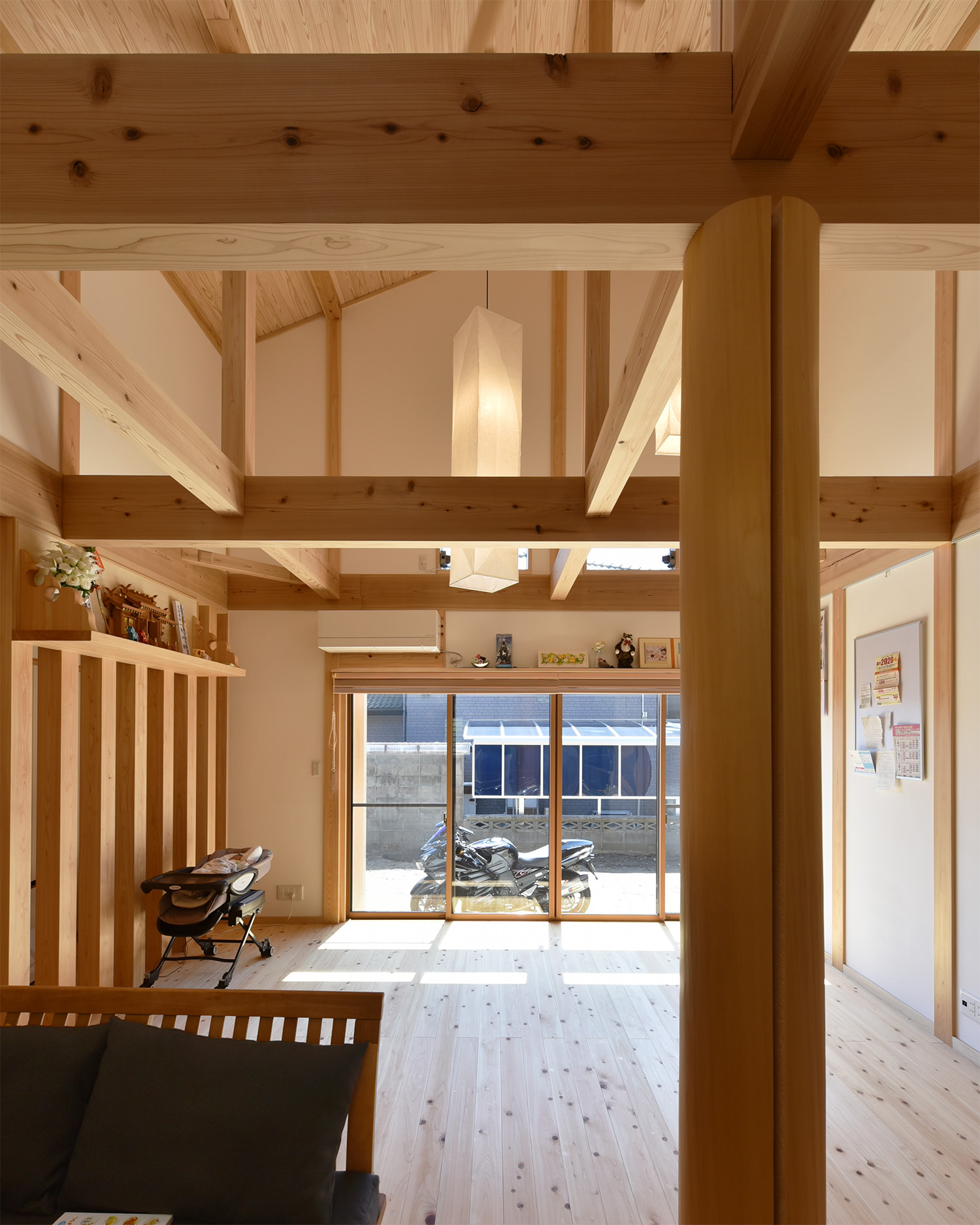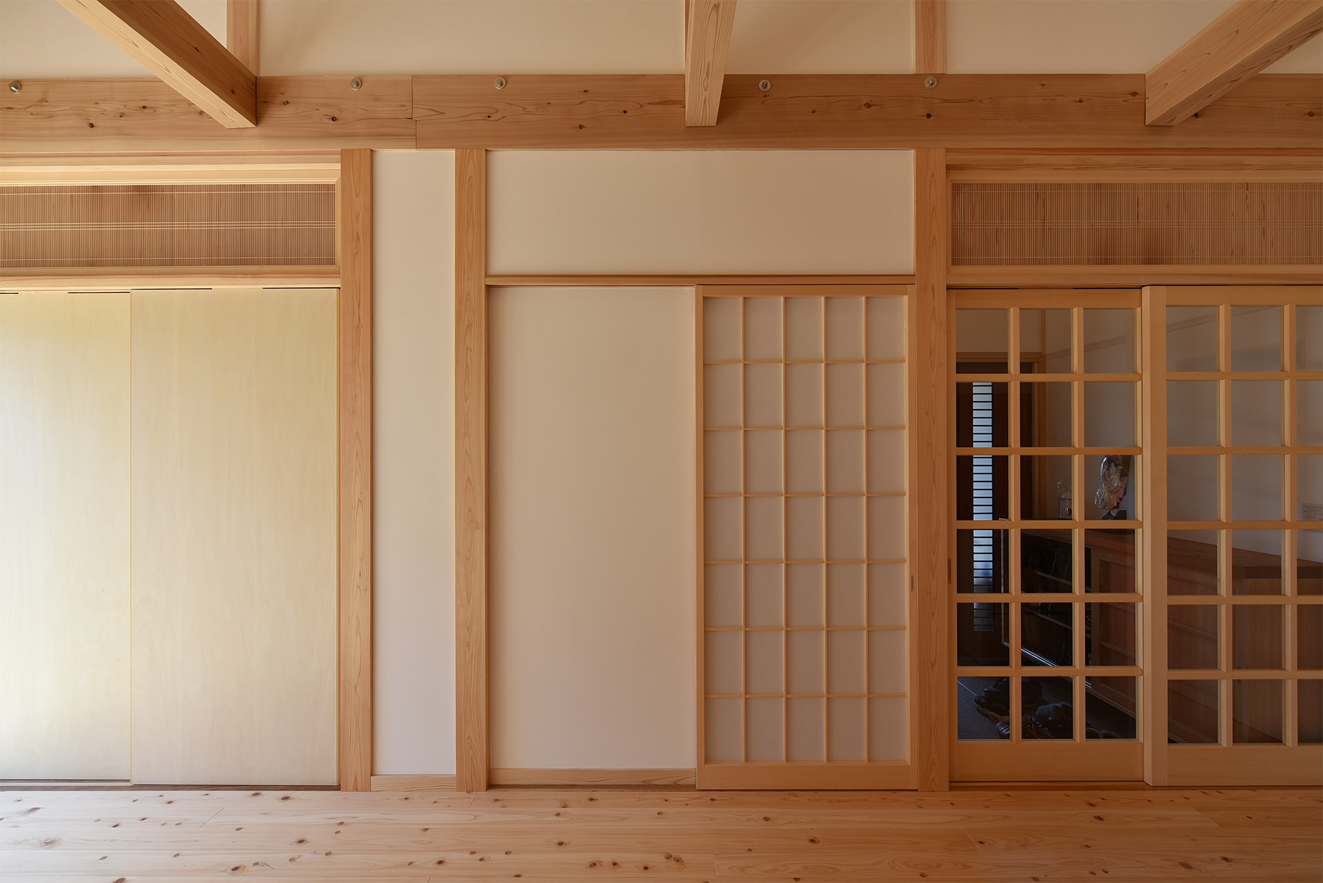平屋建てでも空間の広がりを感じられるように、LDKは25畳の広さと6,000mmの天井高を確保、縦にも横にもゆとりが感じられます。真壁で表しにした檜の柱、杉の梁桁材など迫力のある木の架構美も存分に味わうことが出来ます。また、完全同居型の2世帯住宅になっていて、お母様の部屋の天井高は落ち着きのある高さに抑えてあります。
