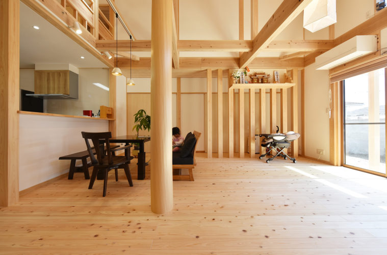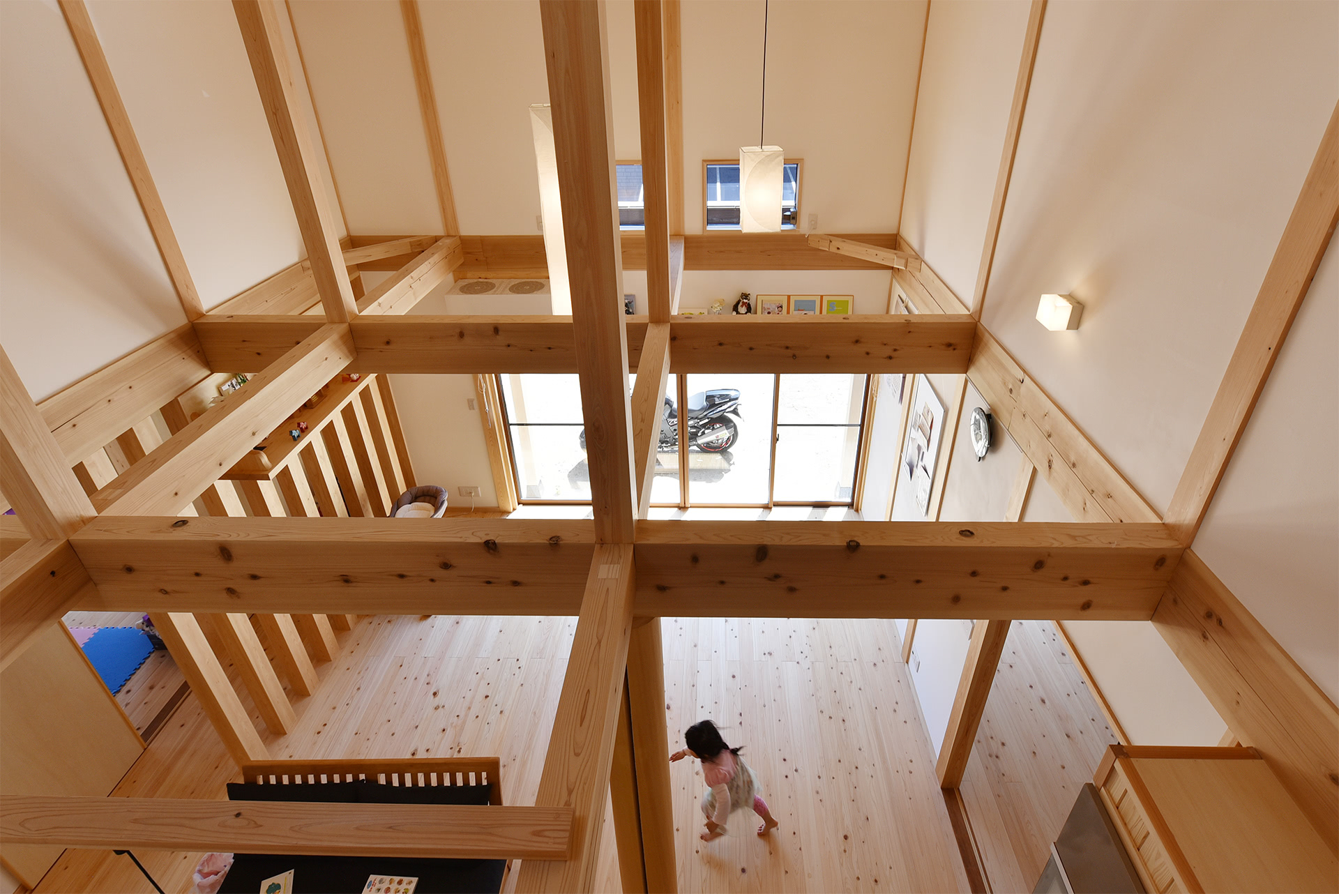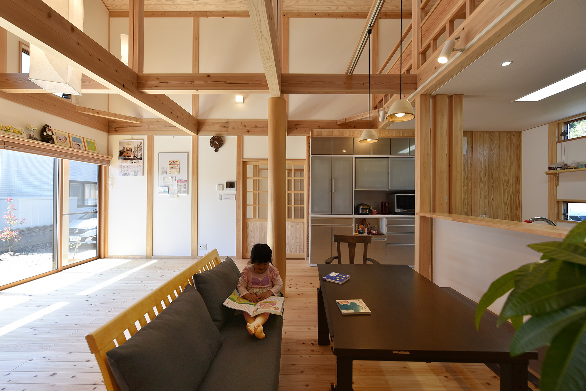 檜磨き丸太の大黒柱が中央に鎮座する、ほぼ2階建分の高さのあるLDK。生活動線を考え、家の中心のLDKから放射状に居室や水回りが広がる間取りにしました。