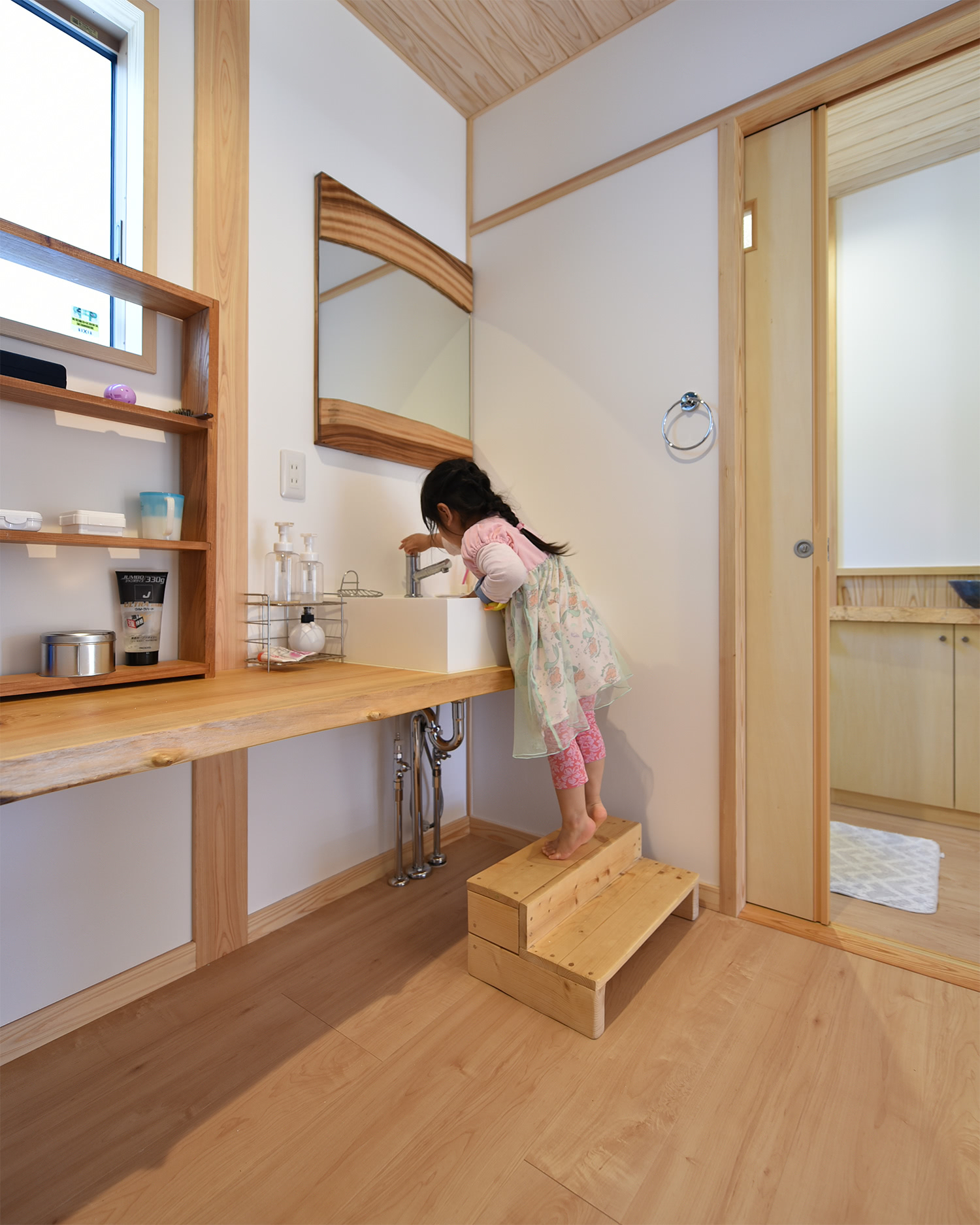 洗面所は水に強いイチョウの一枚板で製作。長さがあるので洗濯物をたたんだりと活躍。ご主人がDIYで作った子ども用踏み台も見事です。