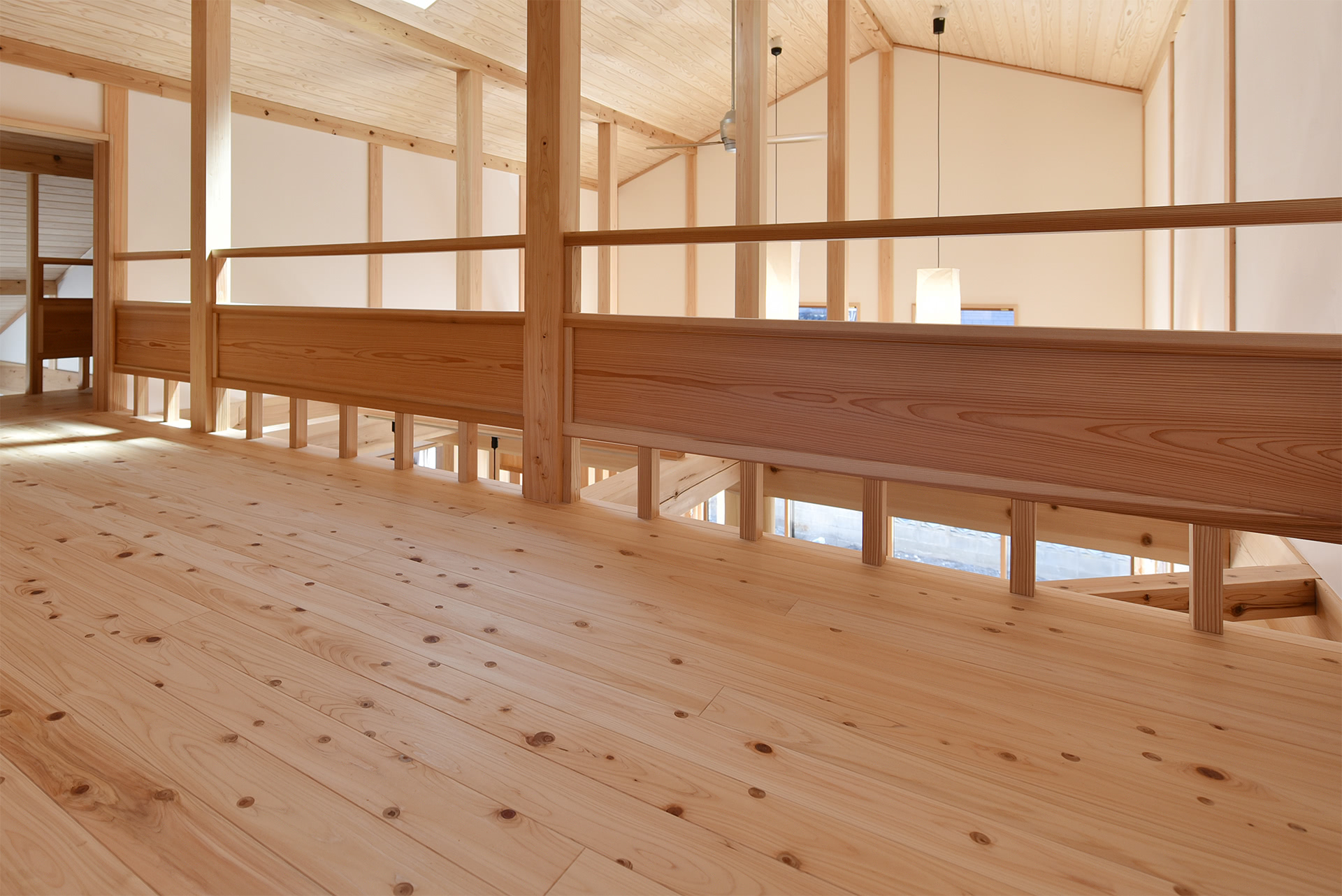 柱・梁・桁など構造材は100%国産の檜と杉で構成されています。無垢の木の架構美を堪能できる仕上げで、木の香りに包まれています。天井は杉板張り、壁は漆喰塗り。