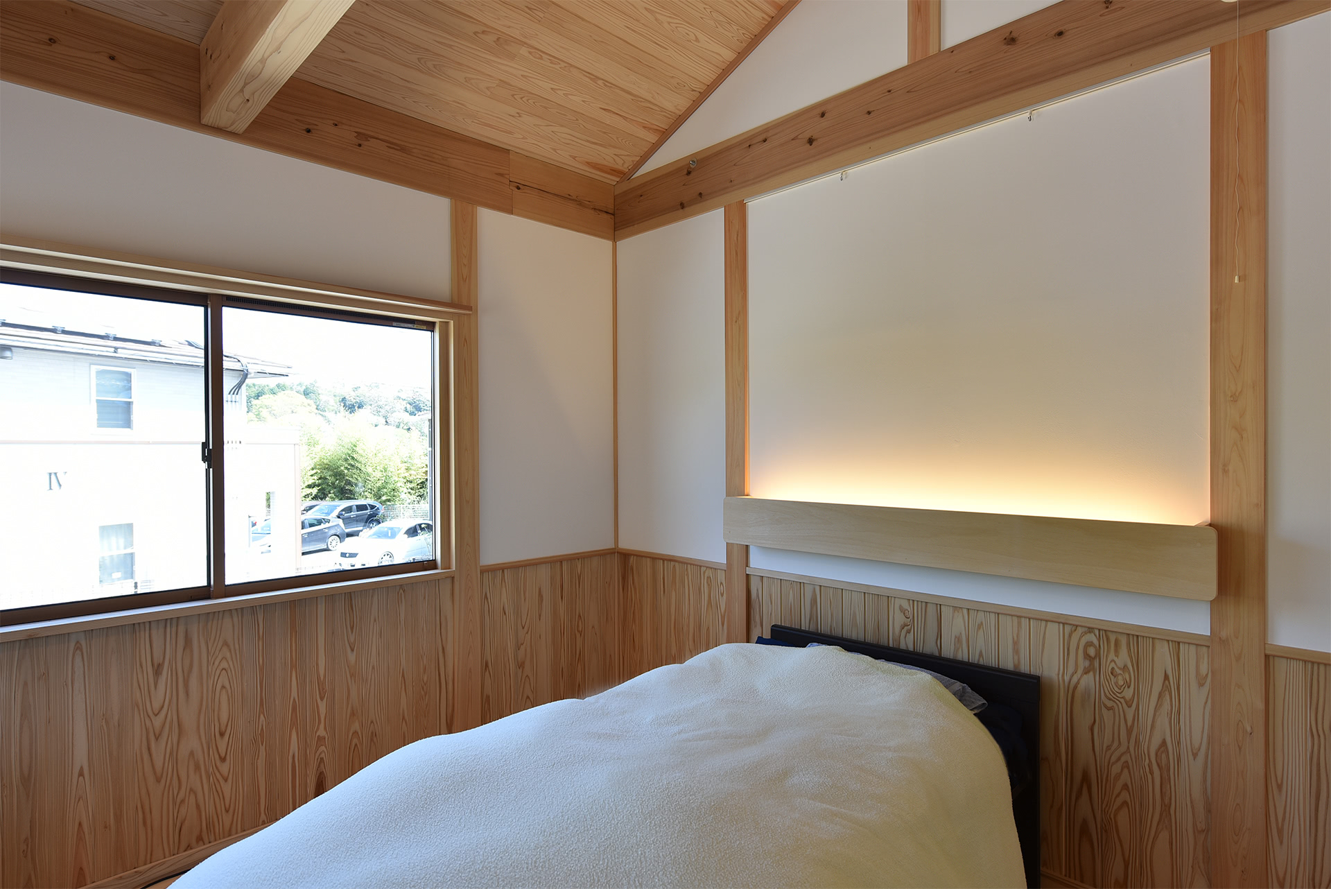 杉腰板張りの主寝室には、リラックスできるよう光のグラデーションのある間接照明。