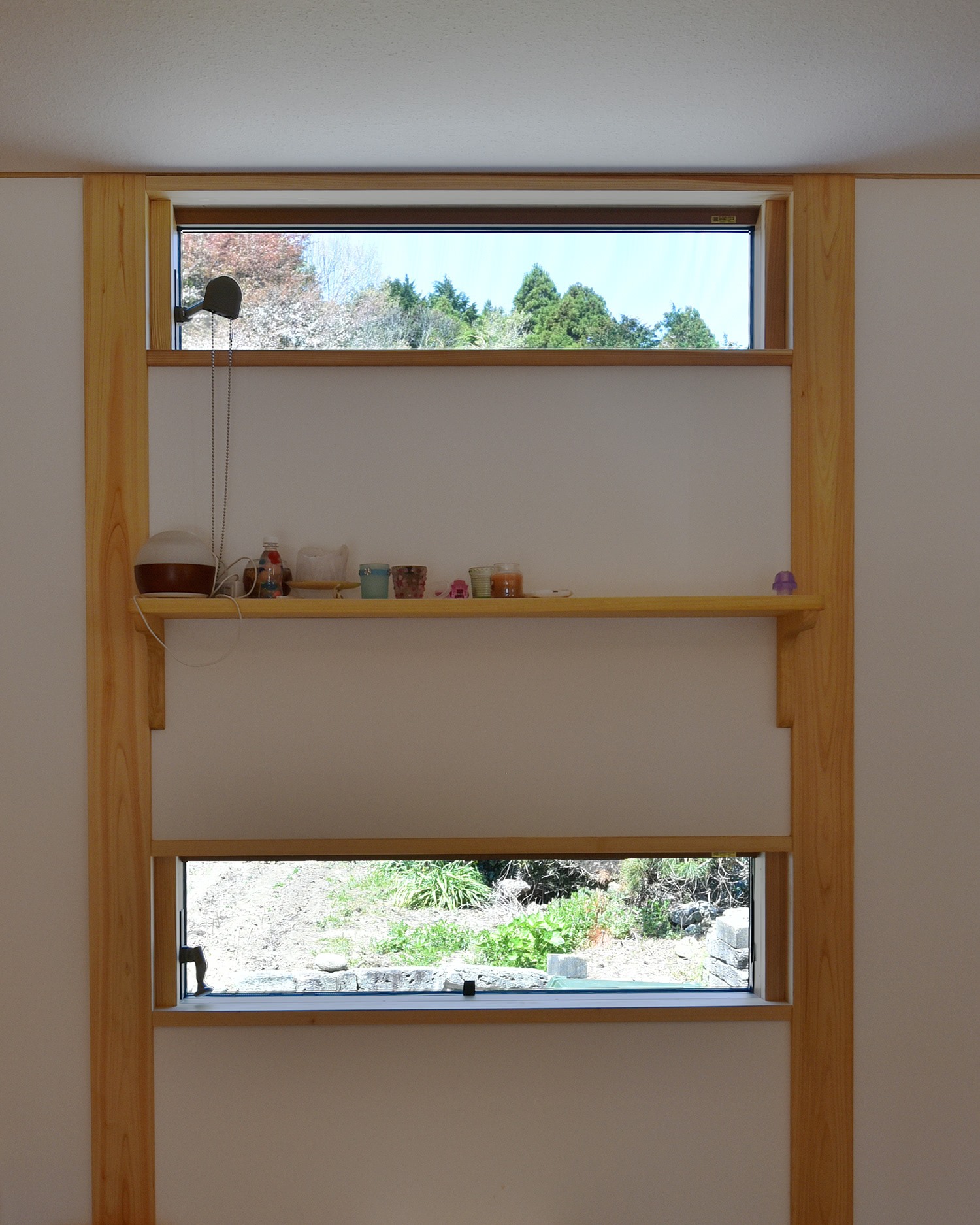 奥様のアイディアで、裏山を借景できる窓を2箇所。抜け感と季節の移ろいが楽しめます。