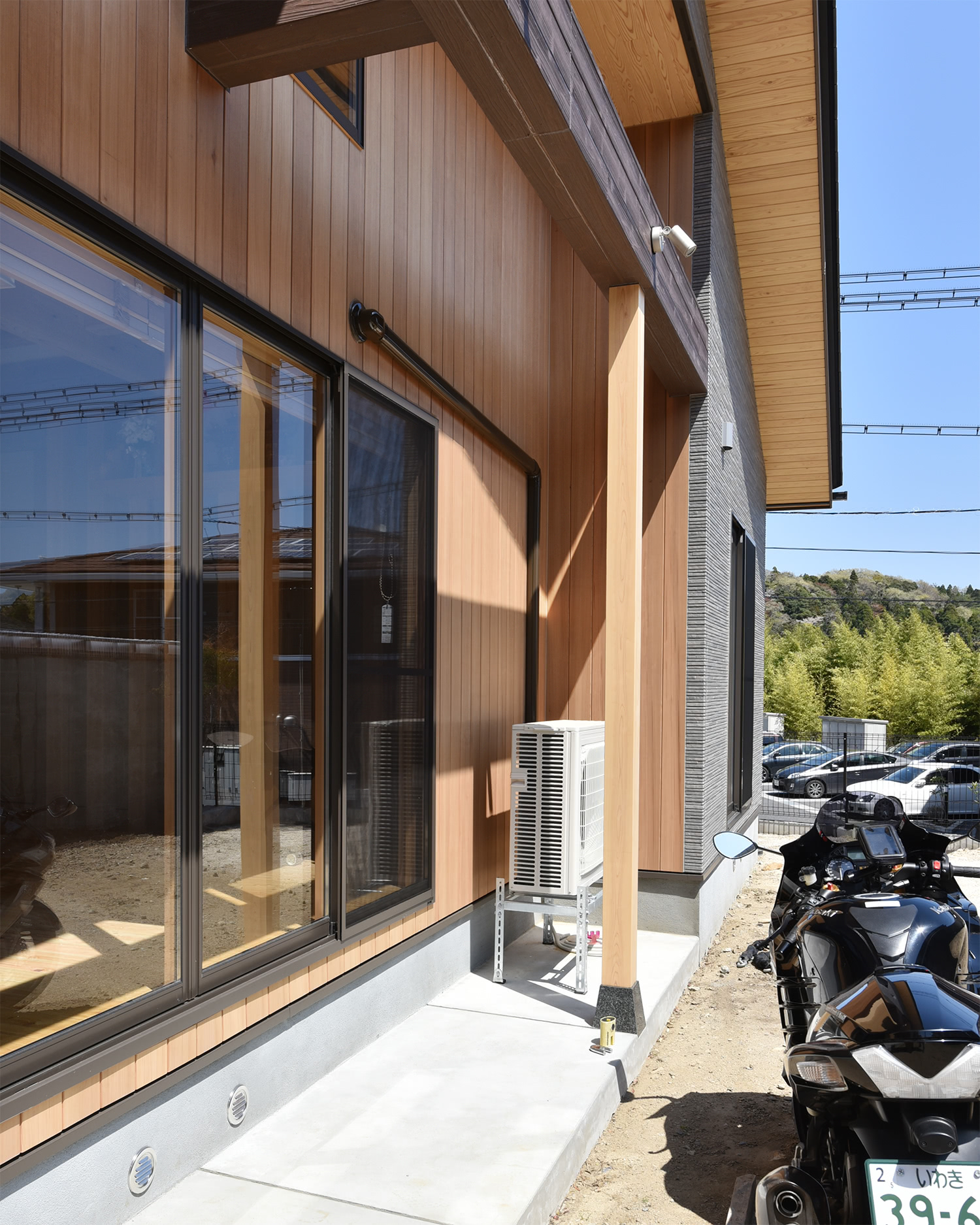 壁は耐水性の高いレッドシダー貼りでアクセントを。軒裏は杉材です。デッキはこれからご主人がDIY予定。