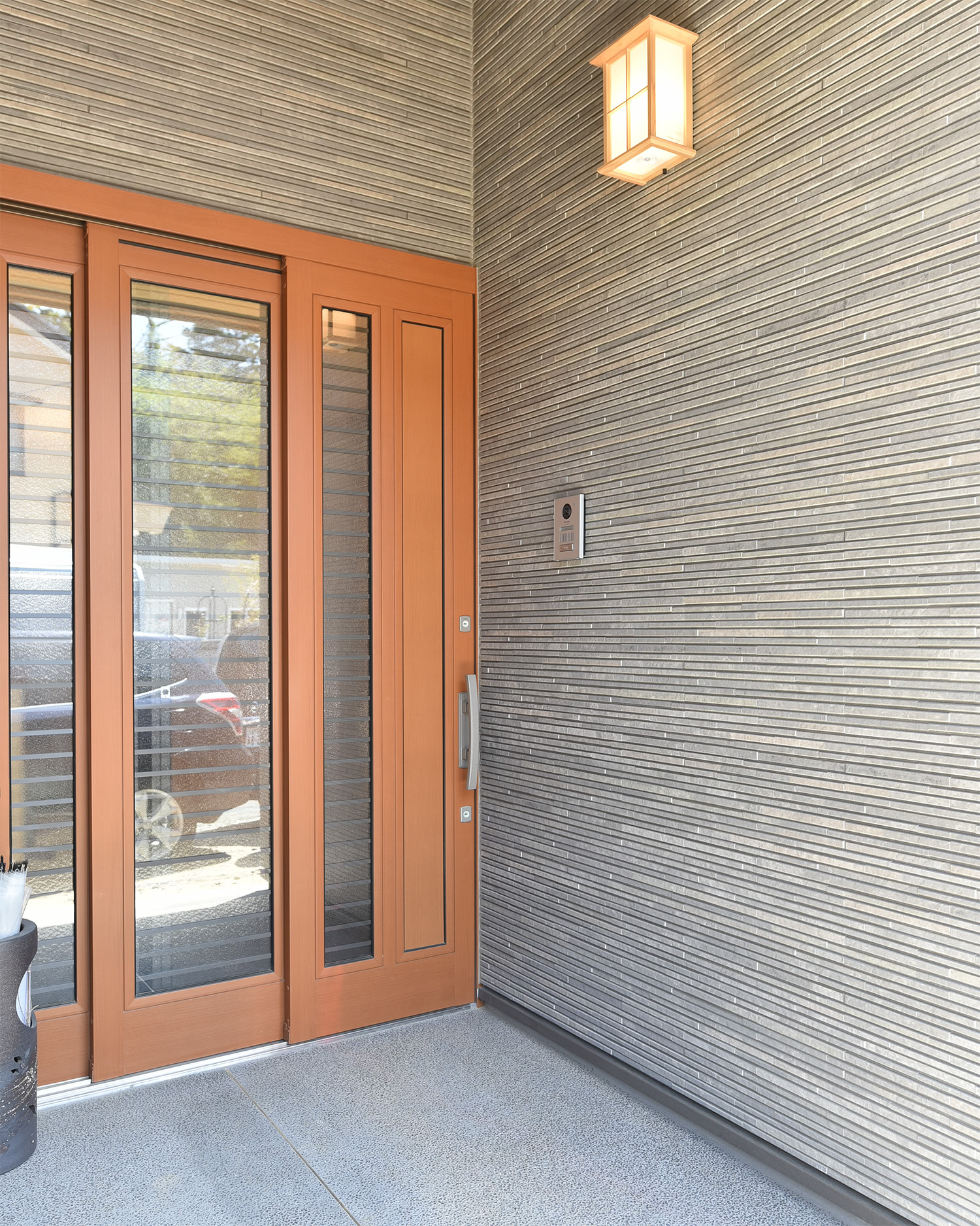 3枚引き戸の玄関ドアは、将来車椅子でも出入りしやすいように。ポーチの照明も和を感じさせるものを選択。