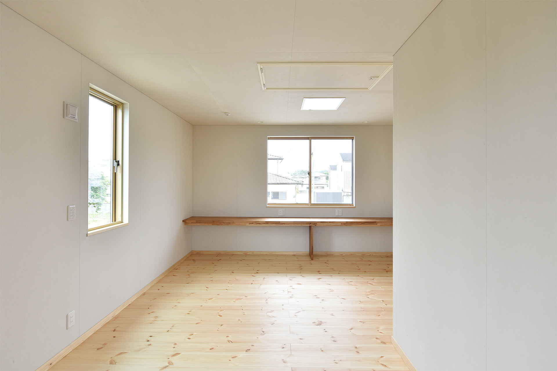 ご夫婦が普段いることの多い約12畳+WIC3畳の主寝室には約4.4mの大きな作業台と、電源を3箇所設けました。