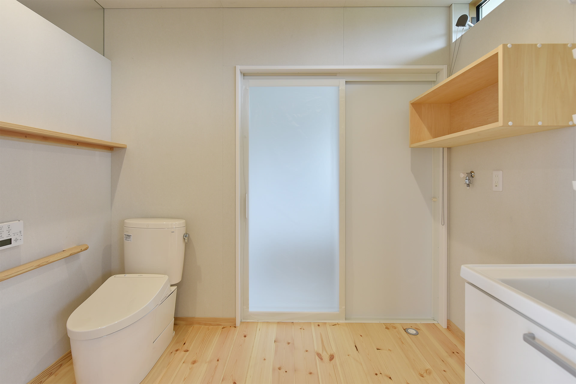 玄関側(トイレ上部)に明り取りのガラスを設置しているので、2面採光となり明るいトイレ兼洗面所。将来の介護も踏まえた配置。