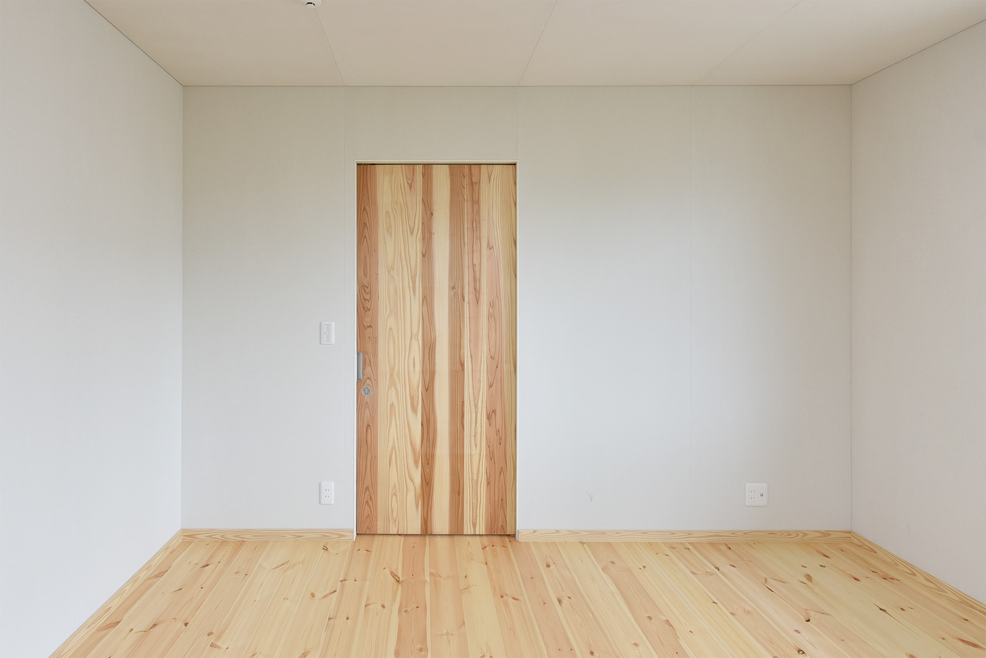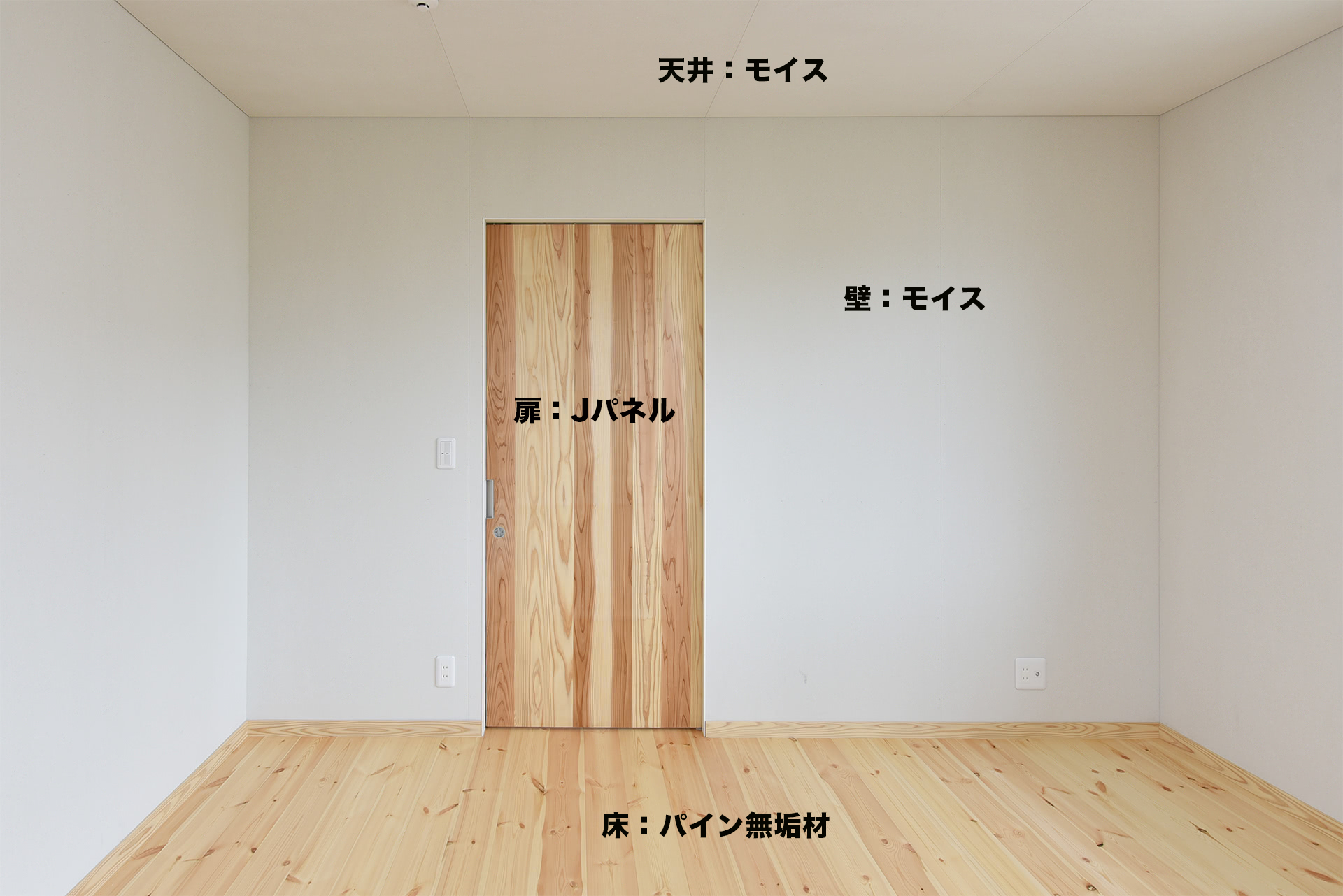合板やMDFのドアは水に浸かると膨らんで修復不可能になるので。Jパネルという杉の無垢集成材でドアを造作。無垢材は中まで浸水しないので表面をきれいにすればまた使用可能です。同じ理由で床材はパイン無垢材。壁と天井は水に対応しやすい素材として全面にモイスを使用。調湿効果が高いことと壁紙を貼らずにコストも抑えて仕上げられます。断熱材は今回は再利用可能なボード系を採用。