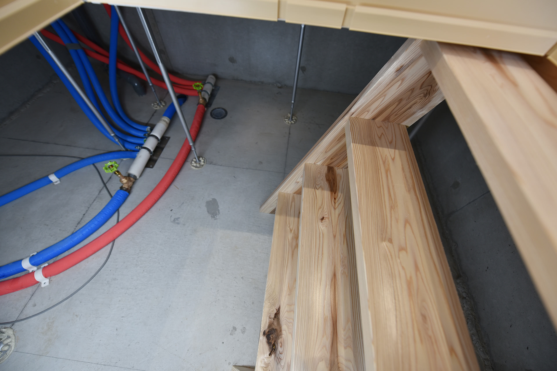 基礎を1m上げた分、高さのある空間が出来たので食料品などはこちらに保存できるようキッチンの点検口に梯子を設置。