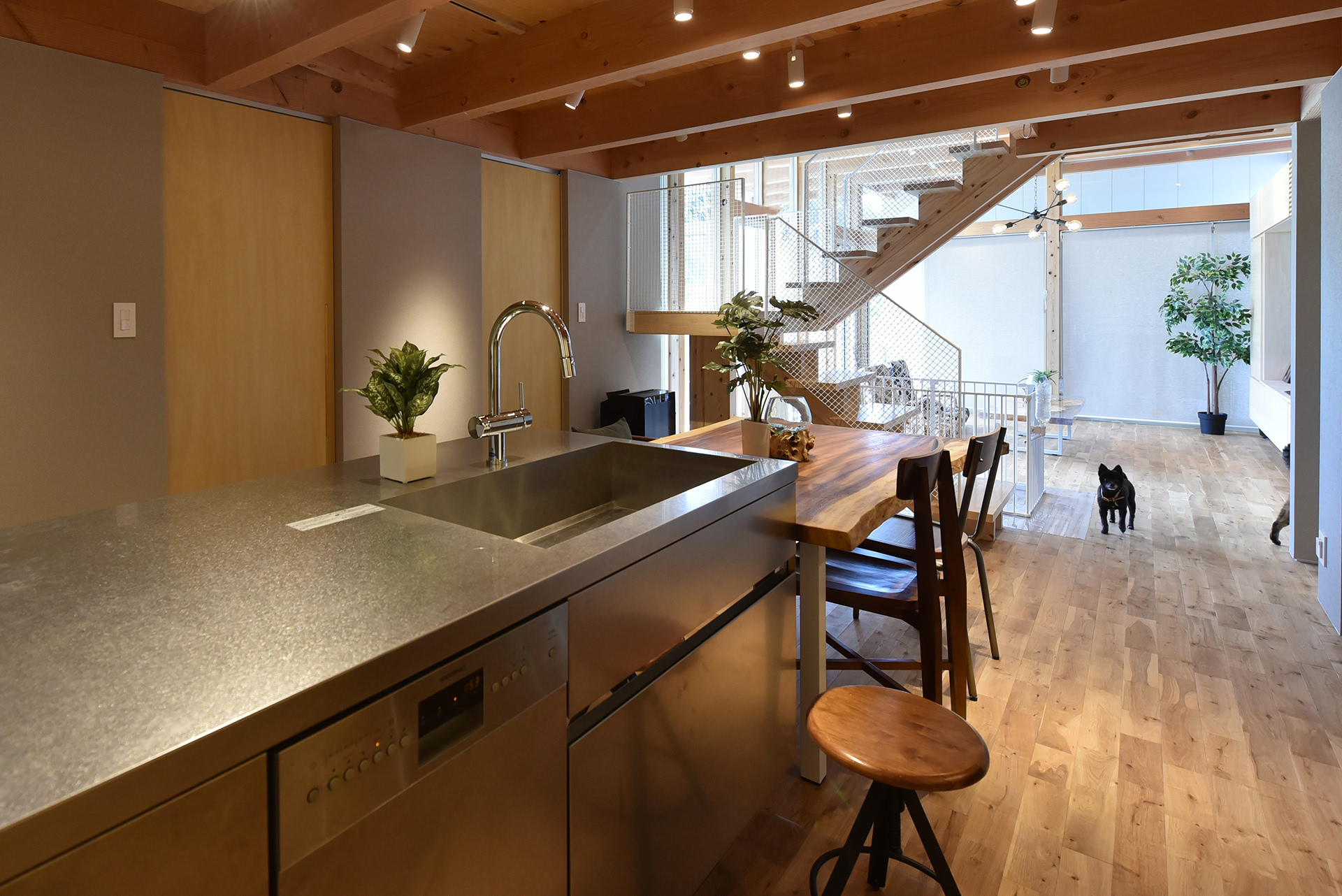ダイニングキッチンからリビング方向。オールステンレスのキッチン。