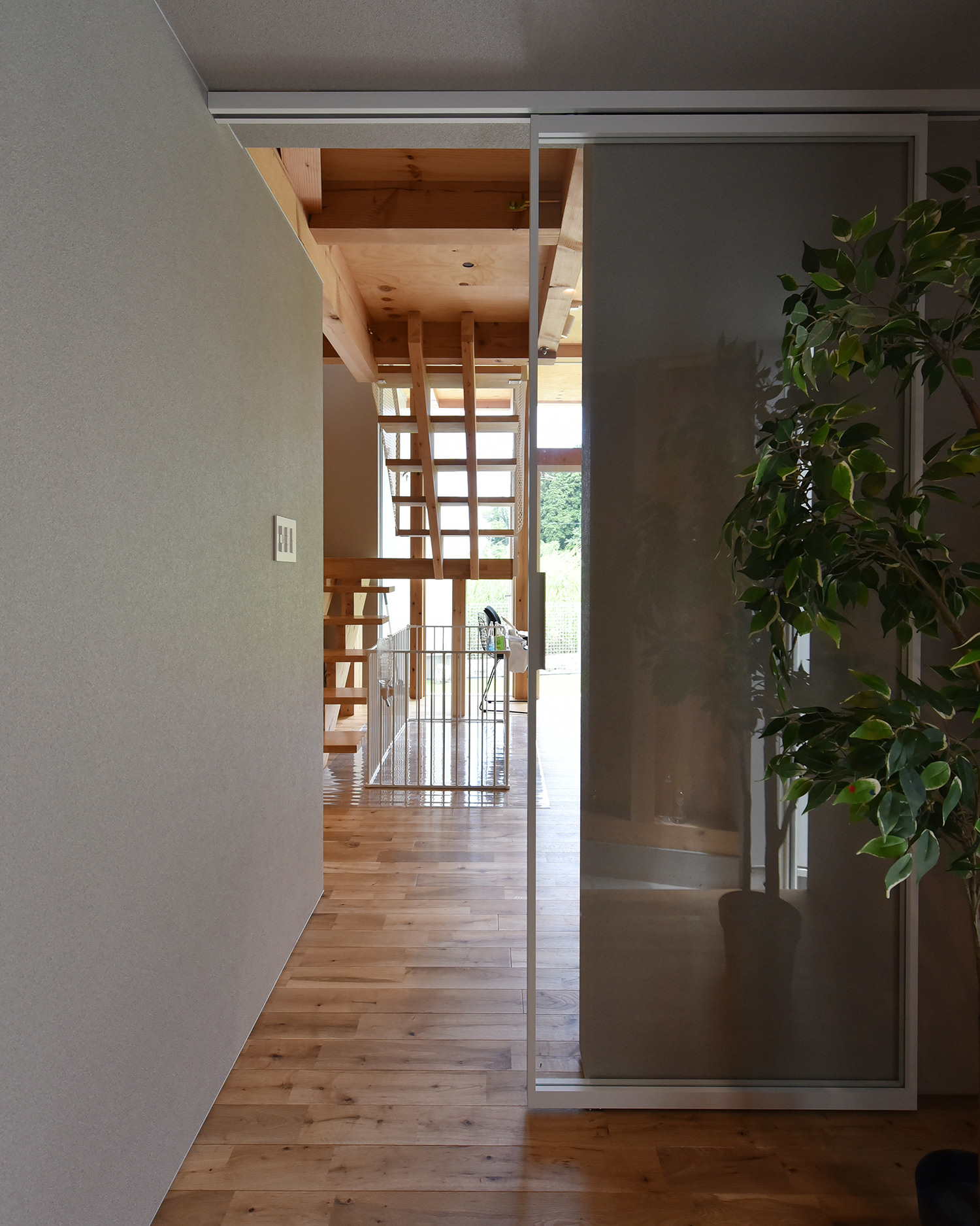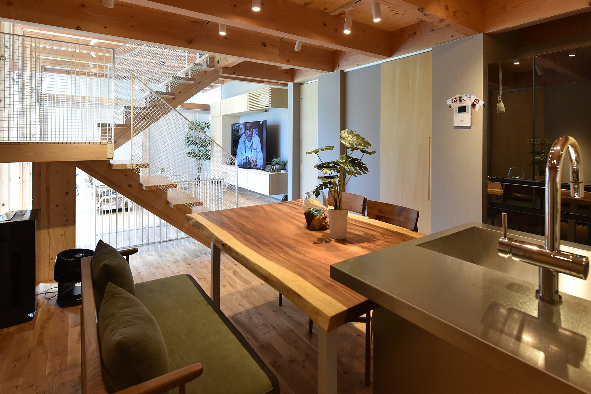 吹き抜け階段でワンルームのようなLDKを緩やかに隔てます。