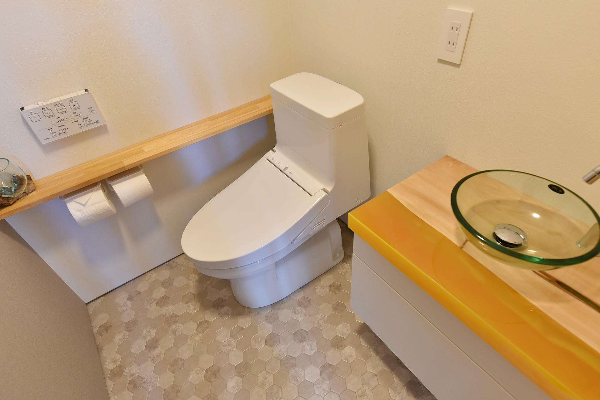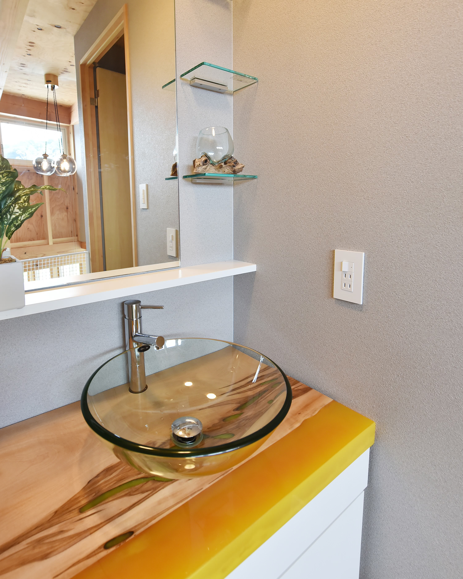 トイレと洗面所にはオリジナル造作カウンターを。黄色のレジンが斬新で爽やかな印象。