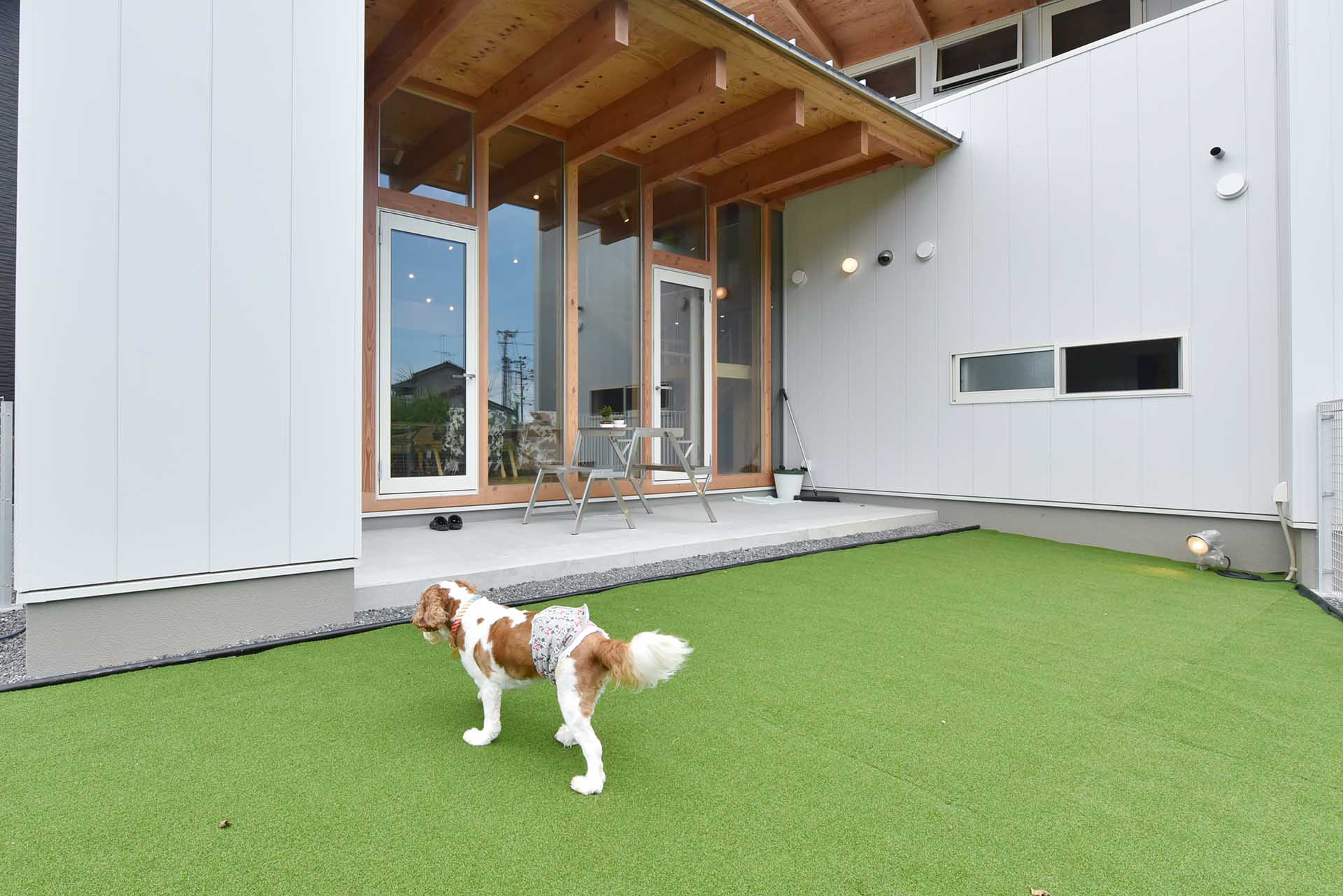 軒を約2,000mmと大きく出しているので、テラススペースも有効に活用できます。ワンちゃんとともにずっと遊んでいられそうです。