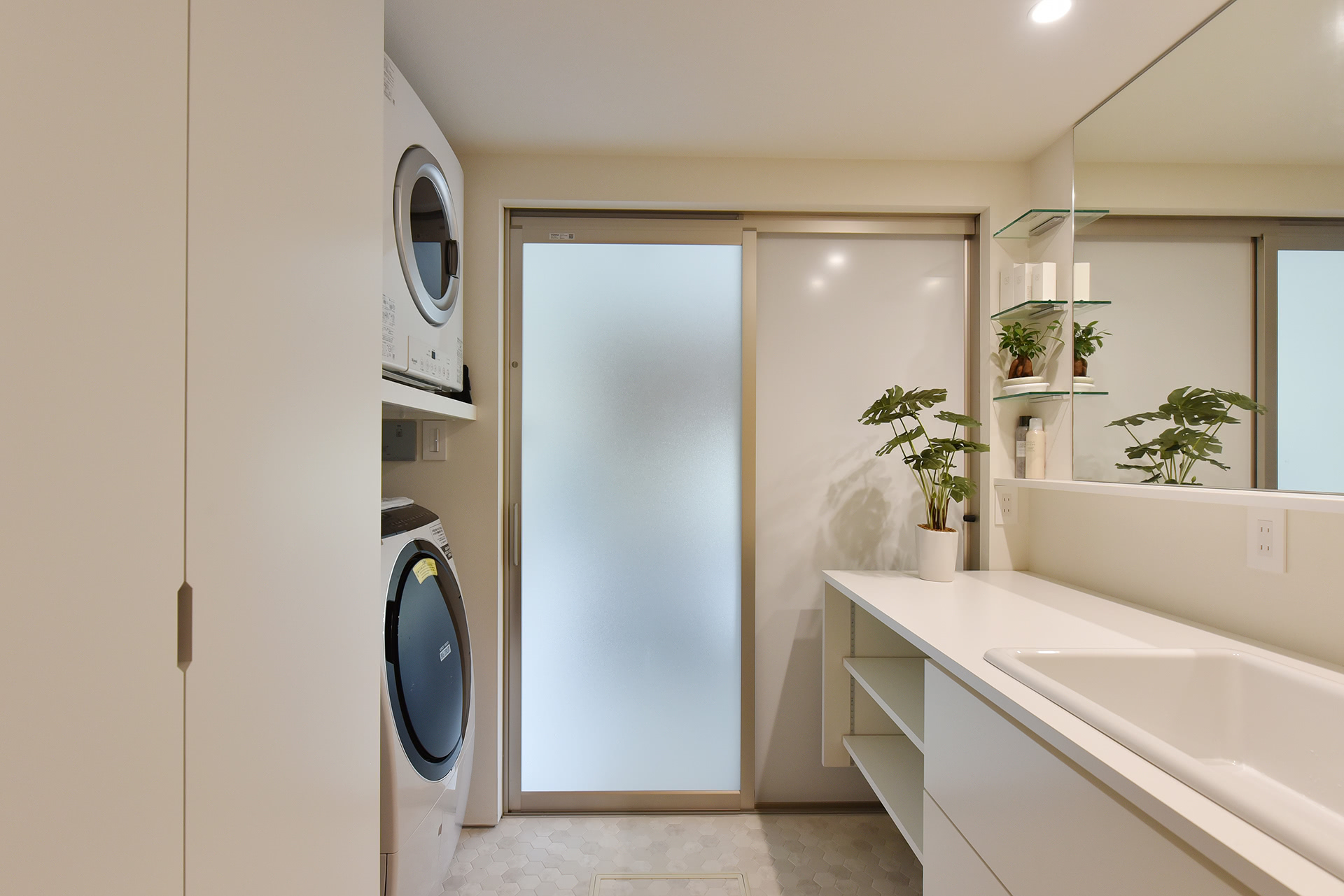 清潔感のある白でまとめたサニタリールーム。収納たっぷり+ダブル乾燥機が家事の心強い味方。