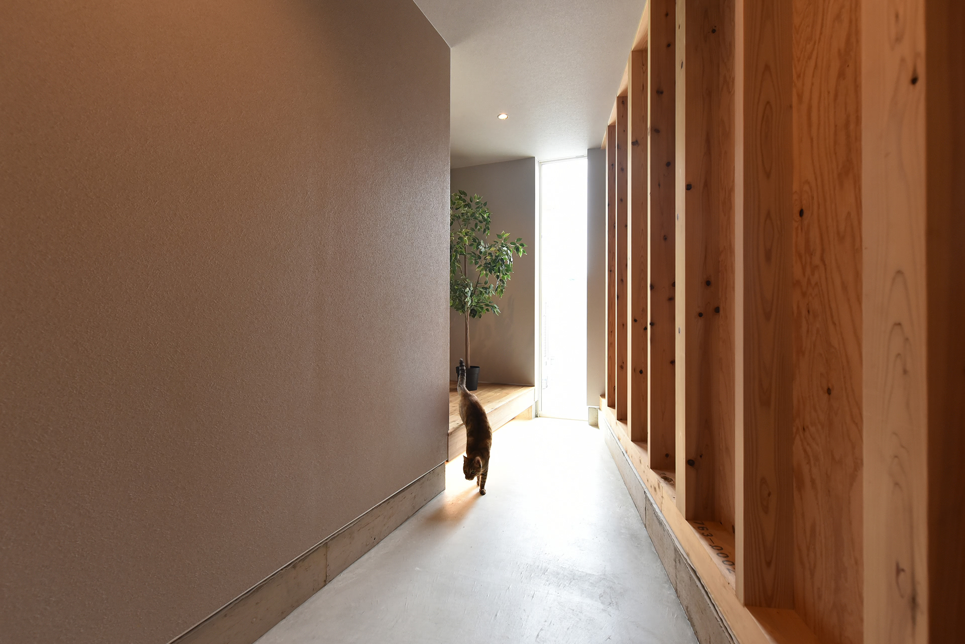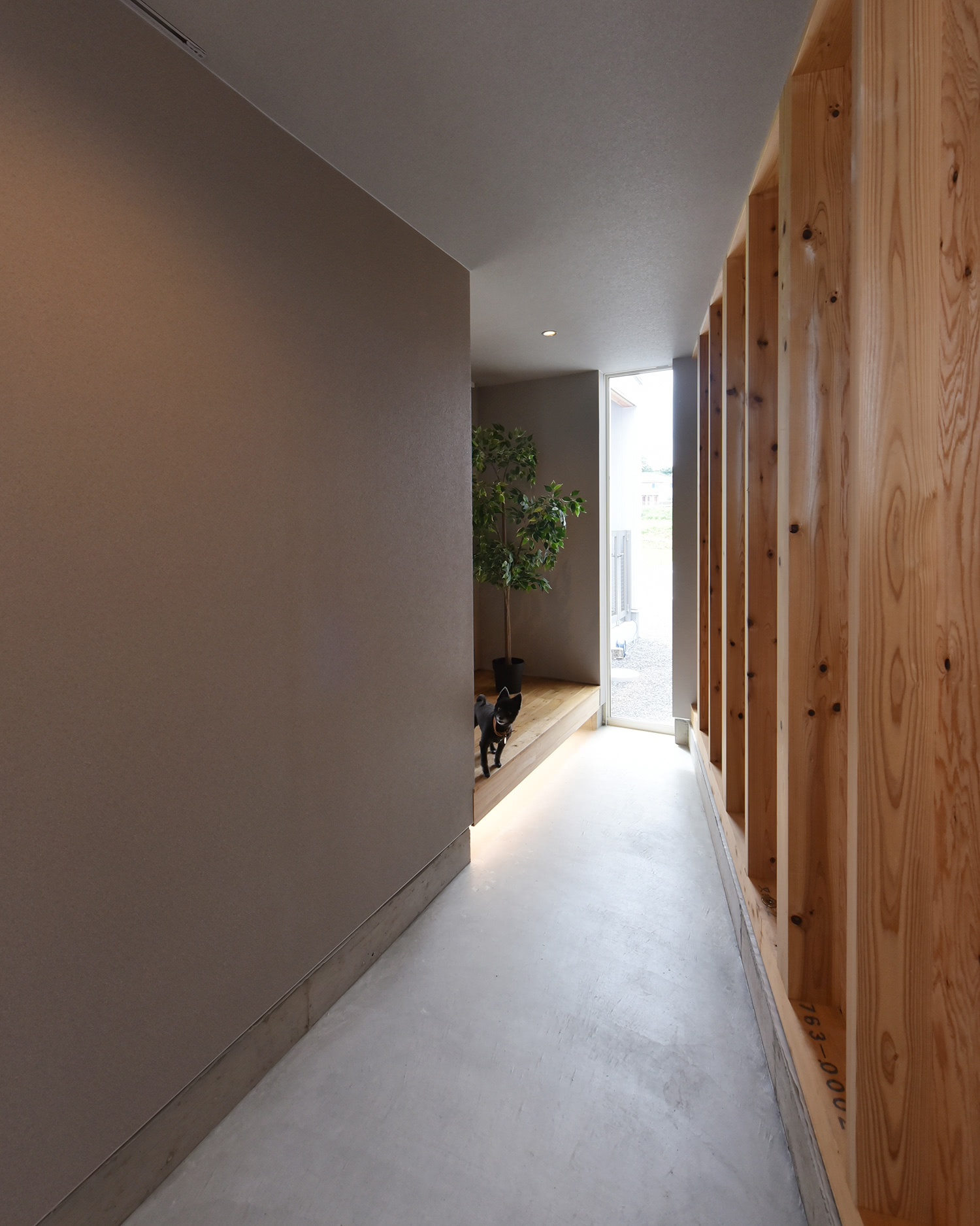 北側のエントランス。左手がサロン部分、右手が入り口。サロン部分の写真はありませんが、ロフトのある天井高さにして収納スペースも確保しています。